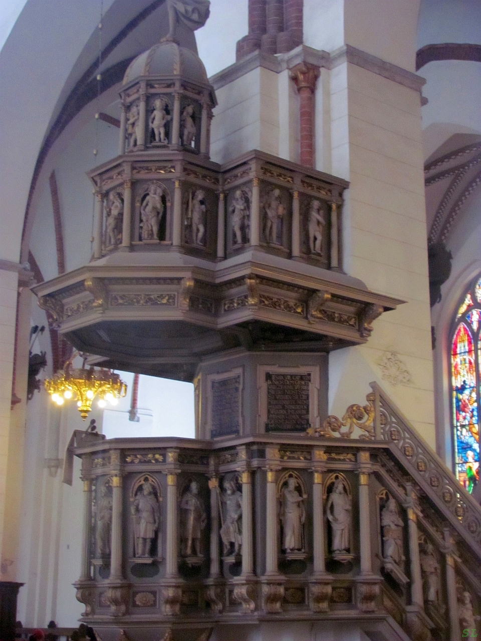 | А вот в стоящую с другой стороны площади церковь Св.Петра мы зашли, но уткнулись в очередь в кассу примерно на полчаса. Зайти в церковь бесплатно невозможно, билеты продавались только в комплексе с подъемом на башню и стоили 9 евро за одного. При этом на табло над входом было написано, что температура на верху 23 градуса мороза. Конечно, башня церкви и ее смотровая площадка интересны, но нам показалось, что не настолько, чтобы заплатить 18 евро и поморозиться. И мы ушли. Хотя сама церковь тоже представляет большой интерес, она находится под охраной Юнеско, строительство ее велось только на пожертвования и началось в 1209-м году. Предполагалось, что это будет главная церковь города. По видимому, из-за того, что во время ВОВ на башне церкви был расположен наблюдательный пункт советских войск, она сильно пострадала от обстрелов. Восстановление её началось ещё в советское время в 1966-м году, а закончилось в 1993-м. | ||