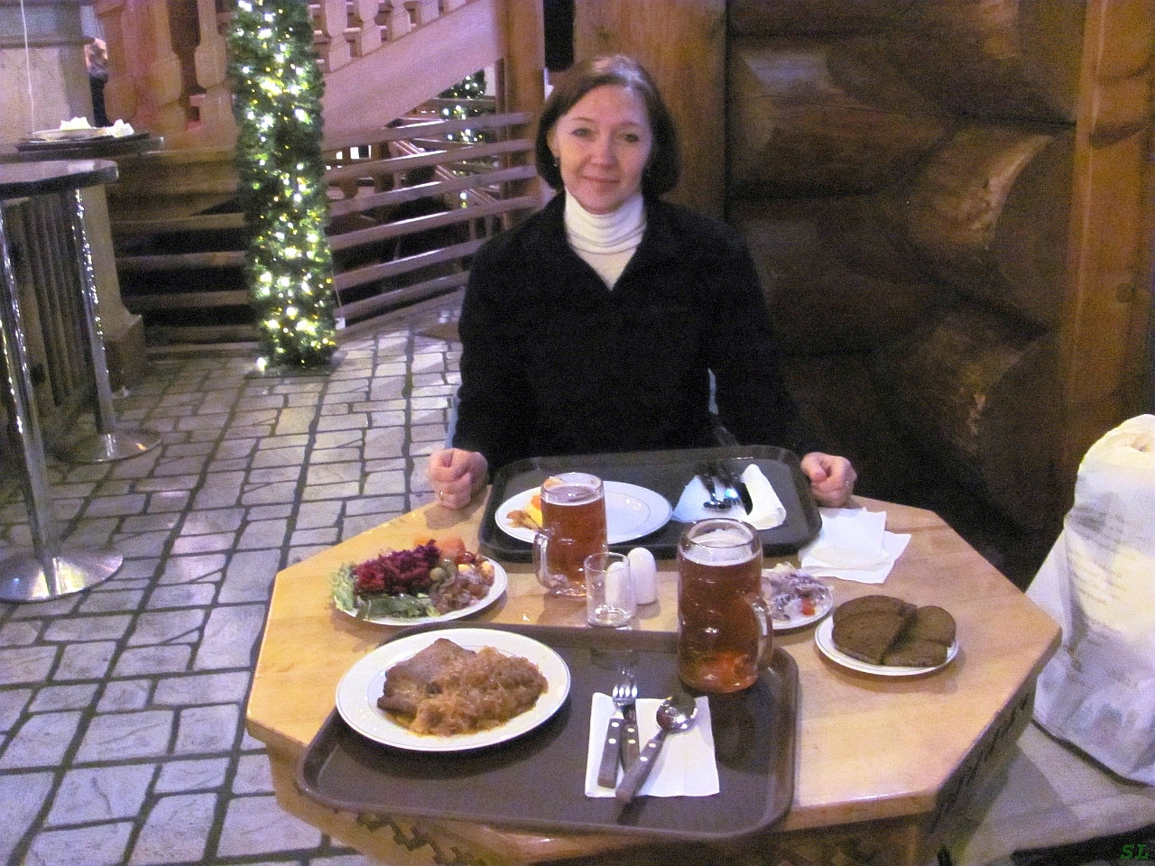 Ну а теперь собственно про Lido. Оказалось, что мы приехали не в ресторан, а в целый городок или комплекс со своим большим двором и парковкой. Конечно, все здесь ориентировано на автомобилистов, потому что комплекс построен практически на трассе. Здесь всё очень нарядно и празднично, сверкает разноцветными огнями. Перед входом в бистро на улице несмотря на мороз играет на трубах ансамбль Дедов Морозов или, скорее, Санта Клаусов, немного в стороне на арене, перед которой ни одного человека, выступают пара каких-то плюшевых игрушек. Еще дальше большой каток и там полно катающихся под весёлую музыку. Мы с удовольствием прогулялись по этому веселью и потом зашли внутрь. Здесь тоже пришлось сначала пройтись и оглядеться. Три этажа, из них один подвальный и везде столы, люди едят и пьют кто что. Система получения требуемого понятна - берешь поднос и набираешь то, что тебе понравилось - салаты и закуски сам - здесь оценивается тарелка независимо от количества продукта, вторые блюда накладывают раздатчики. Напитки, в том числе и пиво, наливается самостоятельно и как следствие, их можно попробовать до оплаты. Потом с подносом в кассу и за стол, который еще надо найти, потому что народу реально много. Вообще-то надо было нам не спешить набирать всякой еды, это мы сразу не поняли и сообразили только потом. В результате, пока ели салаты, вторые блюда слегка подстыли, особенно форель у Марины. Мои свиные ребрышки на гриле с квашенной капустой сохранили тепло до конца трапезы, наверное, теплоёмкость побольше. К добавленным блюдам мы взяли большую тарелку сборного салата, куда напихали все что можно, и блюдце с разной маринованной селедкой, очень вкусной во всех маринадах. Запивали все это пивом, Марина маленькой кружкой, я большой. Пиво, кстати, не впечатлило, Марина тоже ждала от своей рыбы большего. Счет за еду 21 евро, мне кажется, что для системы бистро это дороговато. Вспоминается ужин в Польше вдвое дешевле или примерно такой же по цене в Литве. Можно и про Венгрию тут вспомнить. |