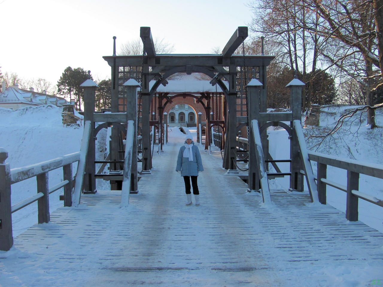 До замка в Бауске ехать километров 10, вернее, возвращаться, потому что мы уже мимо него проехали по пути в Рундаль, кстати, не обратив особого внимания. Около замка наш навигатор впервые за всю поездку слегка взбрыкнул, попробовав нас утопить в речке. Ему показалось, что ближе всего он нас сможет подвезти по ее берегу, но там, как оказалось, не было даже тропинки. Но тем не менее я послушно съехал за мостом вниз по узенькой крутой дорожке и понял, что дальше либо в воду, либо надо как-то развернуться. Дорожка заканчивалась у ворот частного дома. Развернулся, поднялся назад и уже глазами высмотрел парковку около замка. Замок или дворец представляет из себя симбиоз развалин собственно старинного ливонского замка, построенного в 1451-м году, и герцогского дворца, пристроенного к замку в стиле маньеризма в 1596-м году. Потом замок страдал в ходе многих войн, был взорван войсками Петра I-го и потом практически разобран местными жителями на материалы для собственных нужд. В 1970-м году замок был восстановлен. В сегодняшнюю морозную и солнечную погоду замок был очень фотогеничен а мы получили большое удовольствие от прогулки около него. Ветер совсем стих, мороз около 16 градусов совершенно не ощущался и гулять было очень хорошо и красиво. |