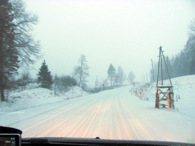 Короче, в 5:30 утра мы уже стояли возле машины и грустно смотрели, как ее засыпала за ночь снегом метель. И продолжала засыпать. Зима началась неожиданно. Десять минут мне пришлось потратить на прогрев лобового и сброс снега, а потом я увидел, что такое МКАД в метель ночью. Нет, ну ехать можно, машин мало но пробито только пару колей и особо не разгонишься, да и неохота. На М9 тоже, несмотря на зеленые указатели, ехали не быстрее 80 км в час. А потом метель стала заканчиваться, только изредка бросала в нас почти безвредными зарядами, дорога высохла и мы покатили. И через 7 часов 20 минут, т.е. примерно в 13 часов дня, проехав 640 км со средней скоростью 87 км/час, мы подкатили к хвосту очереди у границы Бурачки-Терехово, предварительно залив в очереди с латышскими бензовозами полный бак бензина.