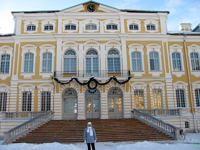 Сегодня у нас последний день в Латвии, и мы решили напоследок посмотреть какие-нибудь интересности. И выбрали для этого юг страны, а там находящиеся рядом дворец в Рундале и замок в Бауске. И потом у меня выбор закончился, на глаза попалось, что в литовском Биржае есть дворец\замок и я его добавил в список. Заодно решили, что воспользуемся случаем и купим в Литве так понравившийся нам бальзам или настойку "Три девятки". Машинка быстро разогрелась, согрела и нас и ехать было одно удовольствие, все дорожки сухие и чистые, только солнце поначалу светило в глаза. Ехать до Рундаля как-то мало, я и не заметил, как мы проехали эти 82 км, хотя по времени это почти полтора часа. Наверное, соскучился по драйву. Несмотря на зиму, машину ближе к дворцу, чем на официальной парковке метрах в трехстах, не поставишь. Сейчас там легковых не было, только пыхтели пара экскурсионных автобусов. Значит, нам придется пересекаться с группами. Но пока мы практически в одиночестве подошли к дворцу. У него типично Растреллиевский вид, думаю, что питерцы здесь чувствуют себя совсем как дома. Так получилось, в основном из-за Бирона Франческо Бартоломео Растрелли начинал свои строительства каменных зданий с этого дворца и им же и закончил. Первый камень в фундамент дворца был заложен в 1736-м году, но потом акцент строительств был перенесен на другой дворец, в Миетаве (нынешней Елгаве), потом ссылка Бирона, и только в 1768 году Бирон переехал сюда с семьей, при этом работы продолжались еще два года. Потом дворец перешел к князю Зубову, страдал во время войны с Наполеоном и был восстановлен. Потом владельцами стала семья Шуваловых. После первой мировой войны здесь была школа, потом склад зерна и т.д. и только в 1972-м году здесь начались реставрационные работы и дворец был к 2014-му году восстановлен в нынешнем виде. В кассе дворца на этот раз пенсионеров не привечали, за билеты и разрешение на фотографирование мы заплатили 11.6 евро. Почему получилась такая цена, я потом не смог определить, у нас был длинный маршрут и 2 евро за фотографирование, но именно такая сумма прошла по карточной выписке. Мне дали для фотоаппарата желтую наклеечку, которую я скоро потерял. Но и поскольку оплачено, то я старался фотографировать внутри побольше, тем более что дворец, конечно же, этого заслуживает. 138 помещений расположились на двух этажах дворца и один зал был красивее другого. И кстати, две или три группы организованных туристов с экскурсоводами оказались почти совершенно незаметными в таком большом пространстве дворца, а уж в "дополнительных" залах большого круга мы вообще были одни. Они к тому же и не отапливались. Поэтому мы и ходили по дворцу в куртках - нас на входе предупредили - у вас большой круг, там замерзнете :). |