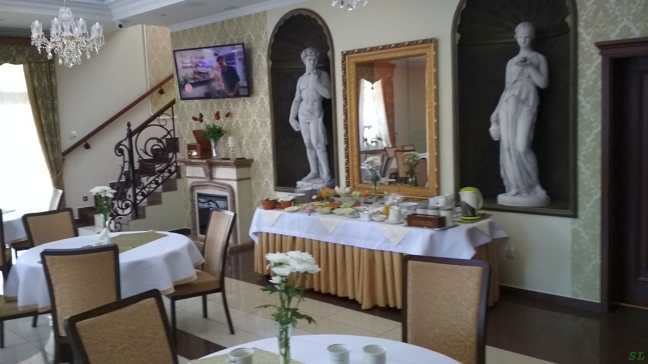 Тут не похоже на отель, привычного вестибюля нет, вход с улицы сразу в маленький бар или закусочную. Но про нас барменша знает и нас ждет, правда, она понимает только польский и немного громкий русский. Но с помощью приглашенной из кухни девушки, наверное, посудомойщицы, которая понимала еще и тихий русский, мы все узнали. Парковка отеля - это его задний двор, как раз напротив его ворот мы оставили машину, сейчас нам откроют ворота и мы заедем. Но, хоть из двора вход в наше помещение и есть, но он через кухню, поэтому носить вещи и просто ходить нам там "не можно". Только вокруг, через площадь... В отельную часть проходим мимо барной стойки в неприметную дверь около неё.