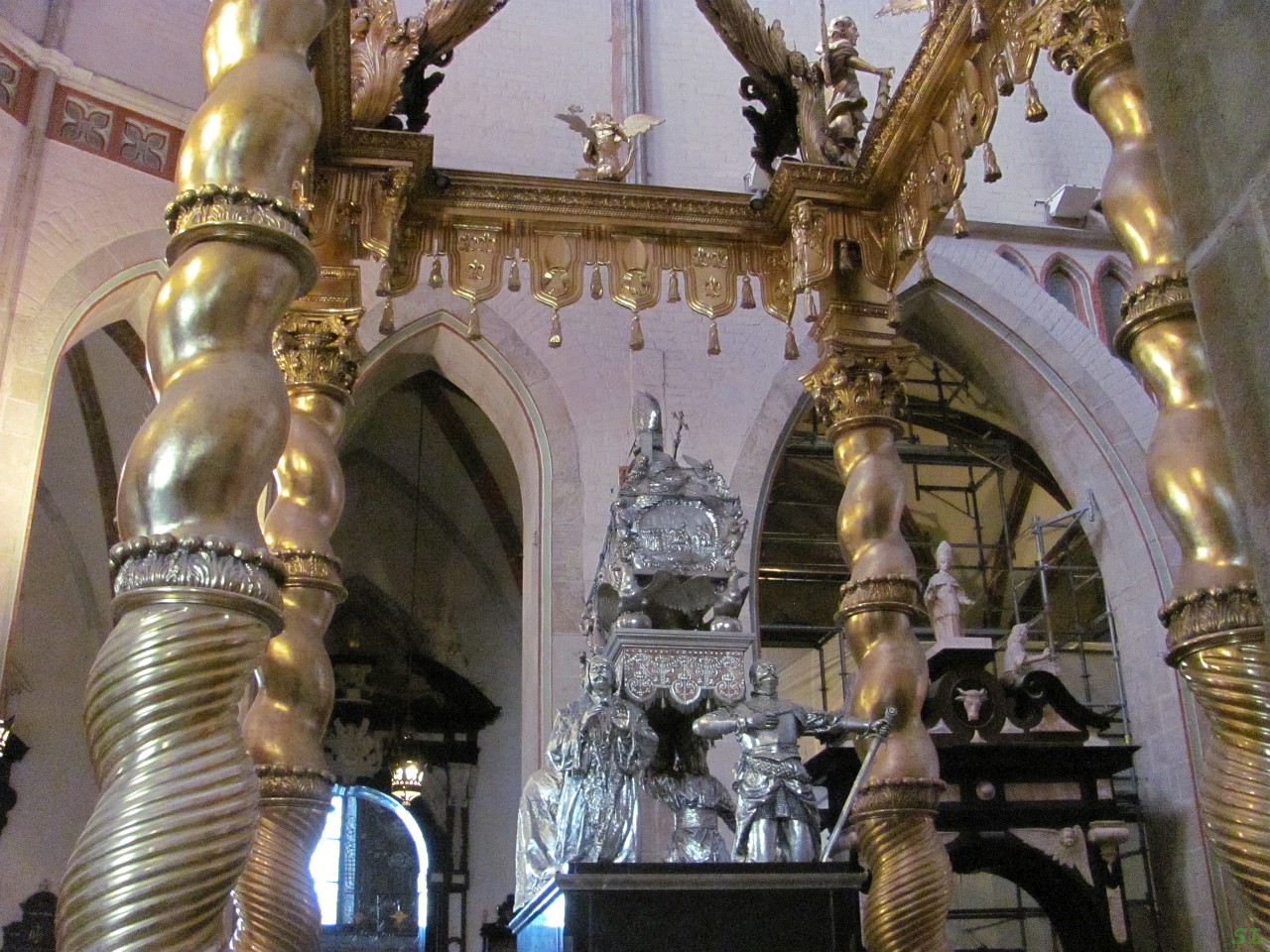 Кстати говоря, собор внутри был весь в лесах и в реставрации и в нем никого, кроме пары строителей и нас, не было. Но мы сразу же полезли на колокольню и получили возможность посмотреть на город сверху. На смотровой площадке покатый и довольно скользкий плиточный пол, так и сносило к её ограждению. Спустились из колокольни вниз, вход в собор открыт, внутри по-прежнему никого, мы и строители. Переглянулись и пошли через леса смотреть на его главную святыню. Здесь, в соборе, в серебряном ковчеге (1662 г.) лежит деревянный ларец 12-го века, в котором покоятся мощи Святого Войцеха.Ковчег установлен внутри позолоченного алтаря на четырех серебряных скульптурах, олицетворяющих разные человеческие сословия. А еще одну достопримечательность храма - его ворота 12-го века, мы не увидели из-за ремонта и опасения, что нас отсюда всё же попрут с нашим четырехзлотовым билетиком, полученным бесплатно. Не могли мы уж очень настойчиво искать реликвии, только мимоходом невзначай глянули одним глазиком :).