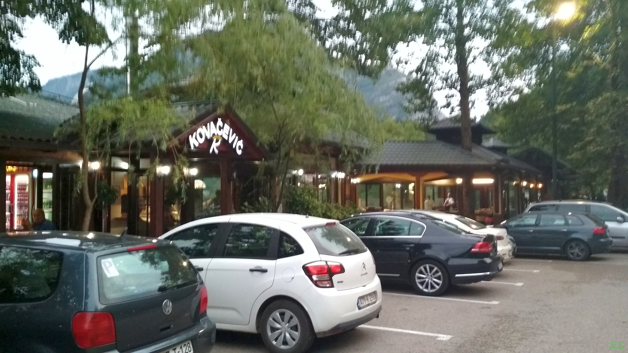 А вообще, место это очень красивое, дорога идет в долине Неретвы, скорее даже в ущелье, очень живописно. Но начинает смеркаться, начались щиты с призывом поесть ягнятины, а это означало, что мы приехали на ужин. На часах 19:40, как и хотели.