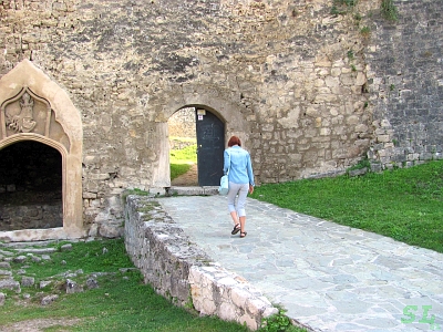 Ну, а оттуда мы потихоньку потопали наверх, на холм, к Цитадели, туда вели асфальтовые дорожки, и Марине было идти легче. У входа в крепость тоже есть касса, так что билеты для ее посещения можно было купить и здесь. Парадный вход, над которым сохранился герб Боснийского королевства, давно заложен для дополнительного укрепления, поэтому теперь вход в крепость через небольшую дверку с прикольной табличкой на ней. Значит, все же постреливают здесь :). Виды, которые отсюда открываются, полностью оправдывают и билеты, и наши старания по подъему. Очень красиво. Ну и конечно же, как и везде, в этой крепости дают рыцарские представления - видны их атрибуты. Видимо, и из луков стреляют, и все остальное делают, что положено.