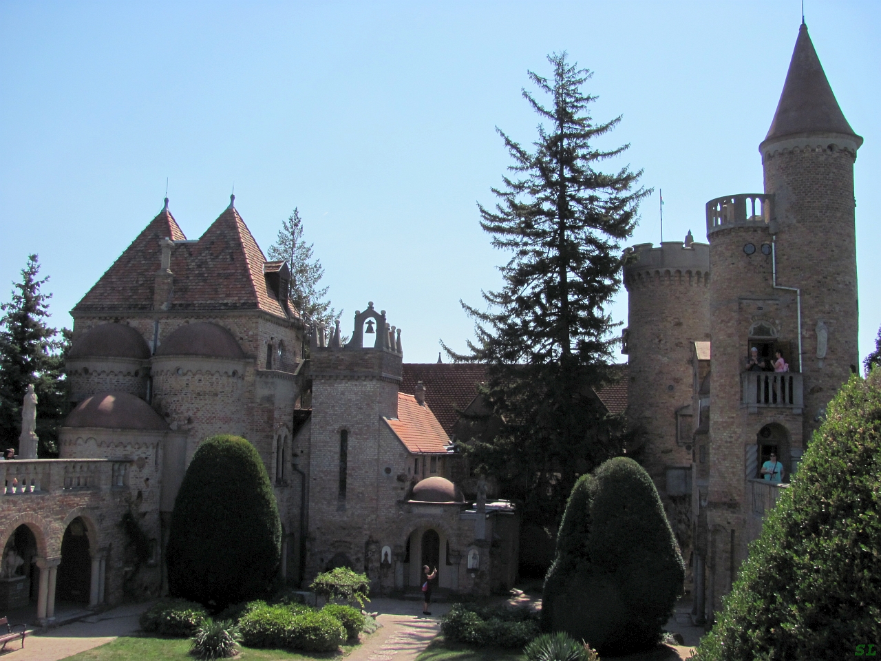 Нет, ну можно кинуться куда-то в центр города, найти банкомат, снять наличные, потом снова лишние пристраивать, двести форинтов ни один банкомат не даст. Неохота. Даю эту денежку Марине - иди и смотри замок, а я посижу тут на лавочке, раз такой бестолковый... Она посопротивлялась немного, но потом согласилась-таки, зря что ли сюда ехали. Даем денежку старушке - давай один билет, раз так... А она, сердобольная, нам рукой машет, проходите оба, чего уж там. Но билетов не дала, нашу денежку сунула себе в карман :). И все рады и довольны. Вошли. Пока мы озираемся, краткий экскурс. Жил в Венгрии скульптор, архитектор и художник Енё Бори (Jenő Bory (1879-1959)) и, видимо, мечтал создать что-то грандиозное. А может, да и, скорее всего, к таким мечтам его сподвигла любовь к Илоне Комоцин, тоже художнице, с которой он познакомился, когда путешествовал по Европе, и потом на ней счастливо женился. В общем, в 1912-м году Енё купил здесь участок, но делать что-то он тут начал только после окончания Первой Мировой войны, в 1923-м году. А начал он строить сказочный замок, практически всё своими руками, и посвятил его своей любимой, поэтому замок этот получил еще очень романтическое название - Замок Вечной Любви. В замке все как у настоящих замков: разные по форме семь башен, около 30 комнат, галереи, внутренний и внешний сады и везде расставлены статуи, а в помещениях на стенах развешены картины. Вроде бы даже этот замок отмечен книгой рекордов Гиннеса, как самое большое строение, построенное своими руками. Несмотря на сказочные формы, практически все Енё построил из железобетона и строил он его по своим проектам на свои деньги, заработанные скульптурами и картинами. И в каждой композиции заложен свой смысл, который можно угадывать или не угадывать и придумывать свое. Меч, подвешенный между башнями, подписан "Jus gladii" - право меча, право суда и мести. "Сама по себе сильная и совершенно естественная страсть, она [ ревность ] до сих пор, вместо обуздания, укрощения, была только подстрекаема. Христианское учение, ставящее, из ненависти к телу, все плотское на необыкновенную высоту, развило до нелепости понятие несмываемого пятна, смертельной обиды. Ревность получила jus gladii, право суда и мести. Она сделалась долгом чести, чуть не добродетелью". (А. И. Герцен, Былое и думы.) Любви без ревности не бывает... |