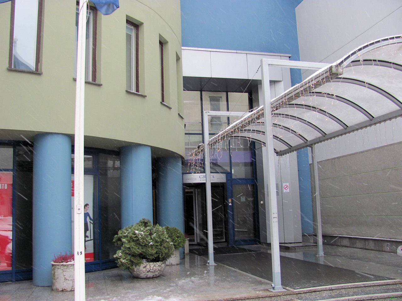 Это отель Grata. Выбирала его Марина по отзывам, там есть завтраки, их хвалили, и ещё она соблазнила меня тем, что в проживание входит пользование сауной с небольшим бассейном. Я соблазнился. Приткнули машину перед входом, это какое-то большое здание, в котором отель занимает не всю, хотя и бОльшую часть. Рецепция на втором этаже. Серьезная девушка дала нам номер, наверное, самый неудобный из всех с точки зрения таскания вещей. Надо было к нему подниматься на лифте и потом еще по узкой лестнице. |
