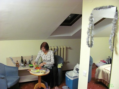 Мы заказали подземную платную парковку (7 евро в сутки), не хотели оставлять машину в новогоднюю непредсказуемую ночь на улице. При этом наша девушка этому очень удивилась, парковка на улице дешевле (3.5 евро). Но деньги за парковку взяла, сказала, как в неё заехать. Я сдал по односторонней улице задом до въезда в гараж, в него надо спускаться вниз, в подвал. Рольганговые двери не сразу, но как-то открылись, когда я в них уже почти уперся. Внутри почти пусто, стояло несколько машин и практически все с русскими номерами. Зато тепло и сухо. И оказалось, что лифт от парковки приезжает только на этаж с рецепцией, но не прямо к ней, а в другое крыло. Т.е. получилось так - от машины мы тащим сумки к лифту (30 метров с одной дверью), едем на нём на этаж с рецепцией, потом тащим сумки по этажу через стеклянные двери к другому лифту (примерно 60 метров), потом на нём едем до конца и снова тащим сумки по узкой лестнице на следующий, самый последний этаж, к себе в номер :). Мы уже давно поняли, что при бронировании через Букинг получаешь чердачный номер в конце коридора. Всегда, когда такой номер у отеля есть :) Зато номер был от всех отдельно, мы тут жили одни, хотя в вестибюле регистрировалась приличная толпа. И разминка получилась хорошей :) |