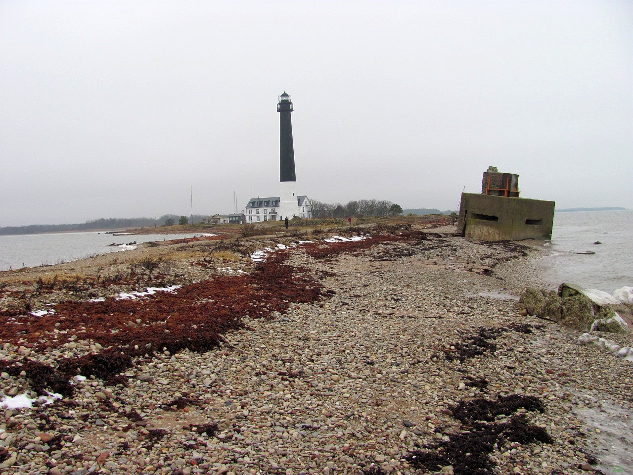 За время прогулки туман почти совсем рассеялся, из него высунулся вчерашний замок, и Николай нас повез на мыс. А что, тоже неплохо ездить на его машине, мне понравилось :). Доехали мы быстро, и на мысе вообще никого, кроме нас, не было, были бы мы тыллями, могли бы утащить их маяк, никто бы и не хватился. Но мы не тылли, и маяк остался стоять, где стоял, поблескивая раз в 15 секунд. Я несколько раз пытался сфотографировать его во время вспышки, но ни разу не попал и плюнул. Первый маяк здесь был построен еще в 1646-м году, деревянный, потом он перестраивался, переносился, дерево заменялось камнем, а потом железобетоном. Нынешний вид маяк получил в 1960-м году. Судя по табличке на двери маяка, летом на него можно подняться, сейчас все закрыто, и поэтому мы просто побрели мимо него и полуразрушенных дотов к оконечности мыса. Здесь все очень сурово и по-своему красиво. Но долго тут не задержишься, сфотографировались на память, Марина снова попыталась полетать, и потопали назад, к машине. |