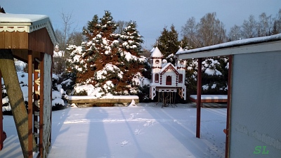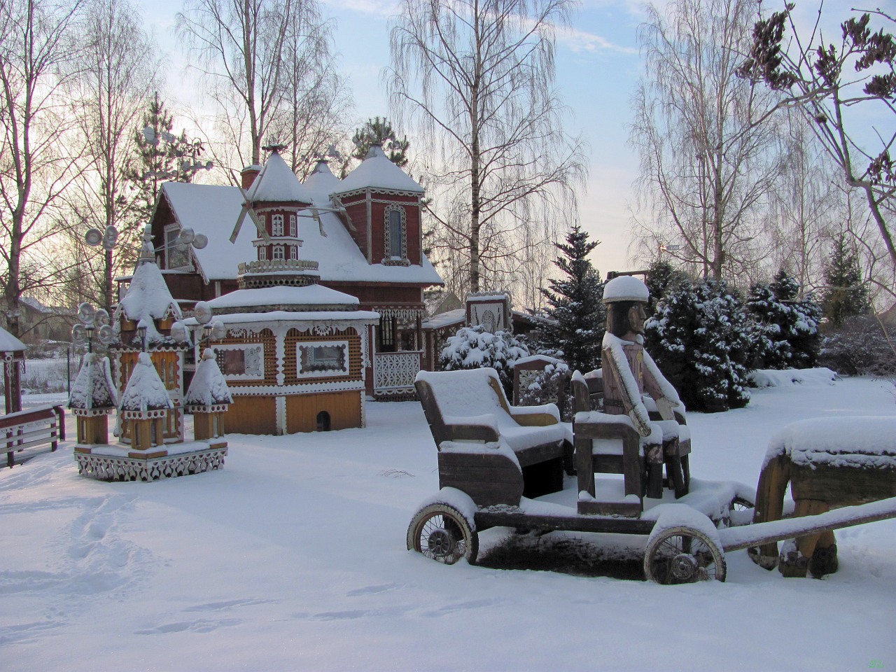 И вот едем мы едем, в машине тепло, музыка играет и вдруг Марина говорит - стой, стой... Ну я еще метров 300 проехал с перепугу, потом всё же понял, что надо остановиться. Марина говорит, там справа промелькнуло что-то интересное, жаль, проехали. Ну, не вопрос, я развернулся и поехали назад. А там, и правда, интересное. Это возле поселка Вецумниеки (Vecumnieki). Действительно, нам Латвия напоследок подарила еще одну сказку. Это парк Juras и он для нас был полной неожиданностью. Закрытый двор, в котором красиво украшенные снегом стояли удивительные милые сооружения, домики и скульптуры. Только потом я по отрывкам сведений в интернете узнал, что все это дел рук одного скульптора по дереву Юриса Аудзийониса. Вроде, бы он был сильно болен или тяжело травмирован, но исцелился и в знак благодарности начал строить такой парк, домик за домиком, скульптура за фигурой... Мы немного ошарашено ходили вокруг огороженного двора и щелкали фотоаппаратом и телефонами через забор. Круто и замечательно. Судя по всему, внутри этих сказочных домиков тоже есть что посмотреть, но сейчас тут ни души. Потом я узнал, что можно сюда получить экскурсию прямо от хозяина, но надо заранее договариваться по телефону.