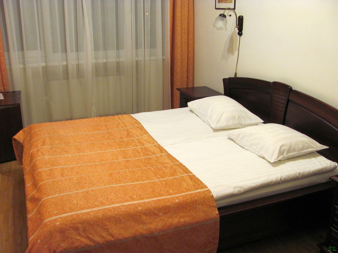 Перед отелем, метрах в 300 от входа парковка, плотно уставленная машинами. Мы туда заехали, сразу увидели Фиат Фримонт с московскими номерами, а это значит, что наши друзья Николай и Алина Комаровы уже здесь, как и обещали, нас опередили и лучший номер заняли. Насчет номера это была шутка, потому что Николай заранее заказывал здесь номер получше и подороже, зато с необходимым ему курительным балконом. На этой парковке мне не понравилось, слишком далеко таскать вещи. Но можно ставить машины и на улице, и снова для нас освободилось такое место уже намного ближе к входу. Ближе тут уже и негде. Девушка на рецепции все нам подтвердила - номер, парковку и 3.5 часа купания. Правда, про часы она не очень была уверена. Номер на втором этаже, прямо около лифта, узенький и тесный, размером чуть больше кровати, зато с самой красивой дверью на этаже из настоящего дерева, может, даже дуба. Конечно же, сразу нарядили ёлочку, почему то не сфотографировали и пошли смотреть, что тут за СПА. |