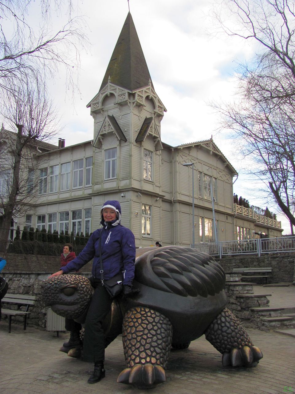 А мы, значит, проутюжили Jomas ielu два раза - прошли ее до конца, до нарядной новенькой церкви в честь Казанской иконы Пресвятой Богородицы, построенной в 2017-м году. Ну и потом назад, искать того дракона и Комаровых. Рядом с церковью установлен Юрмальский глобус, почему-то Марина около него не захотела фотографироваться, пришлось запечатлеть неизвестного господина. Ну черепаха, конечно, посимпатичнее какого-то металлического шара, можно Марину понять. На самом деле гулять было приятно, хорошая улочка. Марина, кроме того, задалась себе целью купить местную парфюмерию известной в СССР фирмы Дзинтарс. Так вот, поиски Марины были безуспешны. Легче купить французские духи, чем рижские. Но французские мы лучше во Франции и купим, если, конечно, нам удастся там еще когда-то побывать (во время прогулки я был уверен в этом). Если с одной сторону улицу "заканчивает" церковь, то с другой монументальное здание гостиницы "Майори" (1926) с зелеными куполами и крышей, которая возвышается над всем городком, но выглядит при этом вполне гармонично. Правда, при ближайшем рассмотрении она выглядит несколько обветшало. Гостиница сейчас закрыта. Зато здание почты (1897), рядом с которым мы наконец-то наткнулись на туринфо, вполне нарядное и ухоженное. В нем теперь жилые квартиры и офисы.