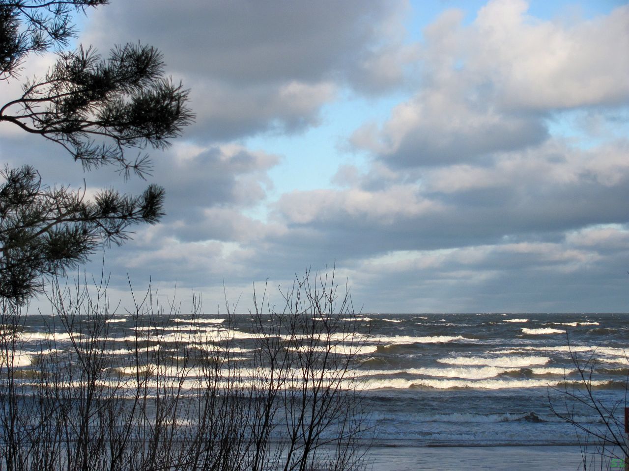 Но мы наконец-то вышли на море... Вон оно, заиграло белыми барашками на сером между соснами. | |