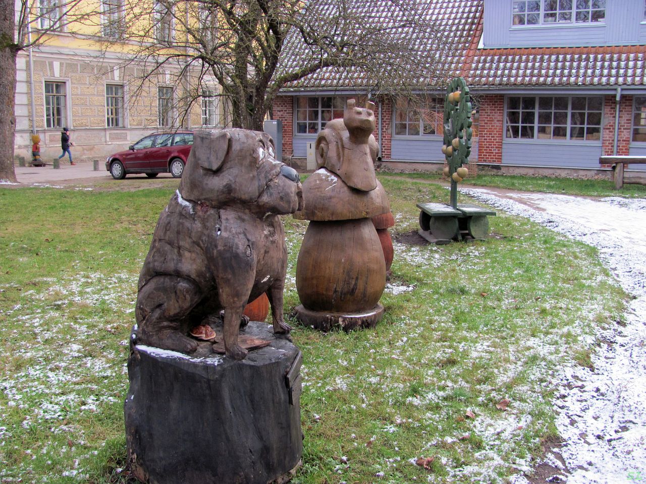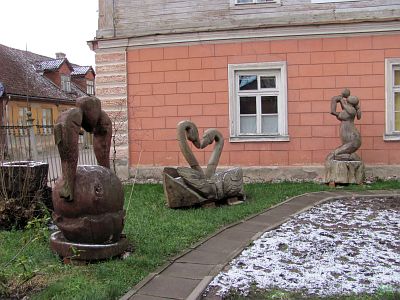 А потом, если идти в правильном направлении, к водопаду Вентас (а мы шли именно к нему), мимо фахверкового дома Герцогской аптеки (16-17 в), то сначала попадаешь в городской парк, а котором там и сям расставлены двадцать две скульптуры работы Ливии Резевси. | |
