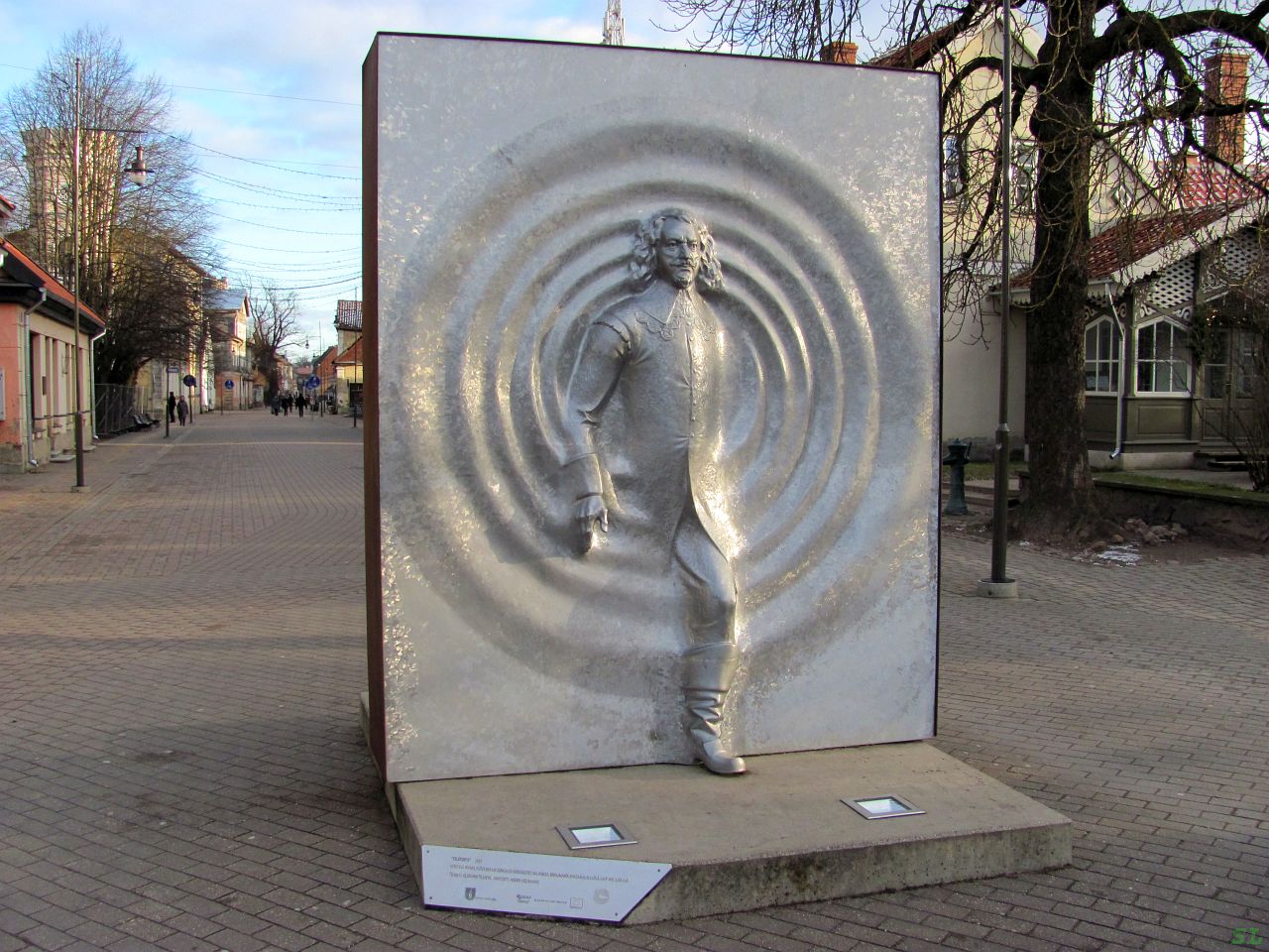 А начинается пешеходка вот с такого памятника. Это "Телепортация", памятник посвящен герцогу Екабу (Якобу), который правил здесь 40 лет с 1642-го года и при нем Кулдига как раз и расцвела. Памятник установлен в 2010-м году к 400-летию со дня рождения герцога. | |