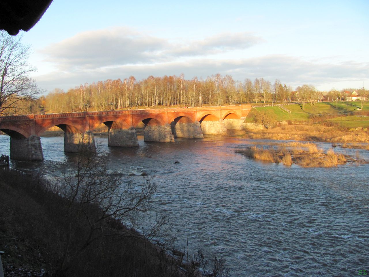 А немного ниже по течению, напротив водопада Вентас, еще одна достопримечательность Кулдиги - кирпичный мост. Это третий по длине (164 м) кирпичный мост Европы. Построен он за год в 1874 году по образцу древнеримского моста через р. Мозель, но в 1915–м были взорваны два его пролета, а в 1926 году мост отремонтировали и в 2008 г отреставрировали, и он сейчас очень хорошо выглядит и служит действительно мостом, по нему и люди идут, и машины едут. | |