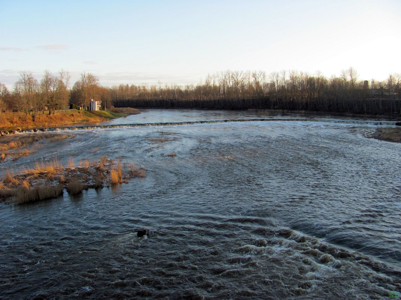 А вот и искомый водопад, Вентас румба. Как я уже говорил, это самый широкий водопад в Европе, его ширина во время паводков достигает 279 метров. Водопад (или порог) естественного происхождения, это природный памятник. При том же герцоге Якобе здесь наловчились ловить рыбу (лосося) прямо в воздухе, подставляя корзины, когда рыба, прыгая, пыталась преодолеть порог против течения. | |