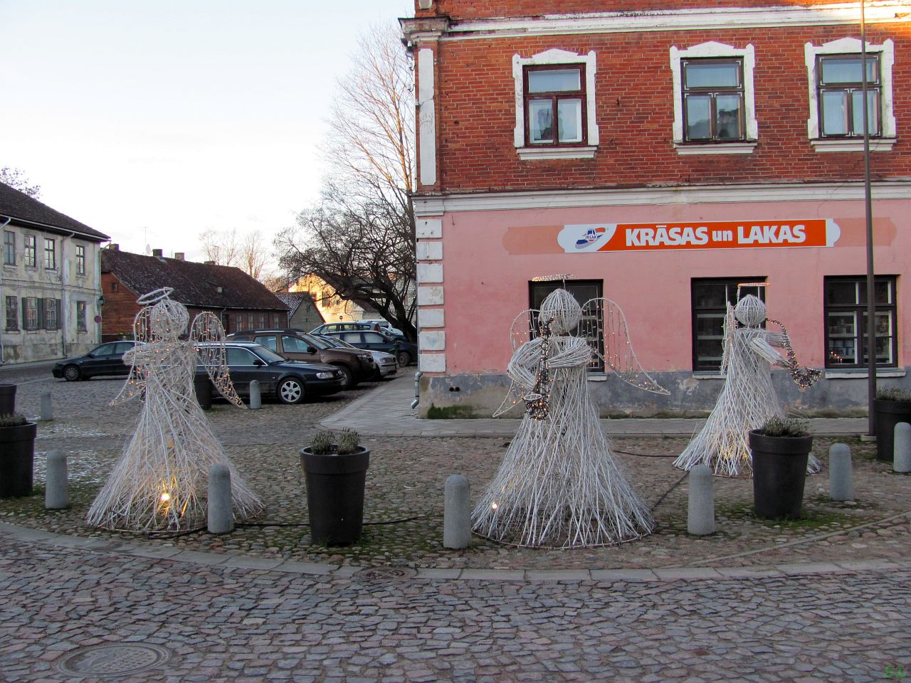 К тому же мы сегодня пока еще не спешили прощаться с Латвией, нам ее почти половину надо будет проехать, 285 км сегодняшнее расстояние, а по дороге мы еще решили, по совету все того же Николая, заехать в Кулдигу. Вот и тронулись караваном, кстати, похоже, в первый раз за все наши встречи получился у нас совместный переезд. Обычно мы с разных сторон приезжали в условленное место и потом оттуда разъезжались кто куда. С отличной и сухой A10, напрашивающейся на езду на круизе, нас свернуло на тряскую узкую дорожку, на которой вдруг началась зима, дорога была местами засыпана снегом, и ехать тут приходилось временами довольно осторожно. Снег не чищен, просто укатан и местами чем-то, видимо, посыпан, потому что от встречных и попутных машин несло какой-то светлой мутью, и в результате, когда мы приехали в Кулдигу, машины были похожи на серые пельмени в муке. Мы не знали, куда нам в Кулдиге надо, поэтому я зарулил на первую увиденную парковку возле какой-то церкви, и Николай за мной. Ну и оказалось, что встали мы неплохо, все будет рядом. Впрочем, там везде все рядом. |