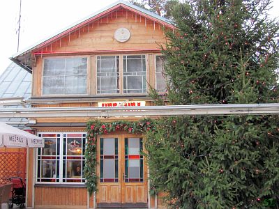 В этом доме в курляндском стиле в парке на холме сейчас музей. Это "Вилла Бангерта". Лиепайский капитан Бангерт купил в подарок невесте приглянувшийся ему домик. Но домик этот не простой, он был российским павильоном на Всемирной выставке в Париже. Капитан Бангерт его купил, разобрал, перевез и поставил на крутом берегу Венты. Из домика, по рассказам, открывается самый красивый вид на р.Венту. Мы не проверяли, но верится. | |