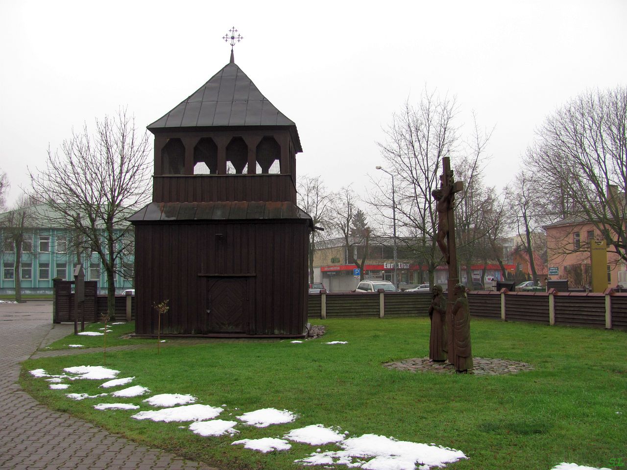 Город старый, впервые упомянут в 1372 году, история его, как и многое в Литве, связана с родом Радзивиллов. Историческая сеть улиц и площадей, его старинные здания сохранились до наших дней. В 1969 году Старый город был признан урбанистическим памятником республиканского значения. Подробности его истории, конечно, можно прочитать на страницах интернета, я не буду их сюда перепечатывать. Мы просто пойдем гулять и смотреть на город. И начнем с той самой черной церкви. Это костел св. Иосифа. В начале XVIII века в Кедайняе поселились монахи кармелиты, и в 1766 году они построили этот костёл. В 1963 году костел Св. Иосифа был закрыт и превращен в склад. В 1991 году костел был отреставрирован и возвращён верующим. В довольно просторном дворе, кроме звонницы, нас и деревянных скульптур, вообще никого не было, и костел выглядел закрытым. Мы обошли вокруг и уже собрались уходить, когда я заметил на углу малоприметную дверцу. Толкнул её и хоп - она открылась и мы внутри. Там тоже никого, только картины и алтарь, и холоднее, чем на улице. Непонятно, как тут можно было молиться, в такой обстановке, наверное, потому и пустота. Но туристам, хочешь не хочешь, надо терпеть, поэтому мы тщательно все осмотрели и побежали на улицу греться.