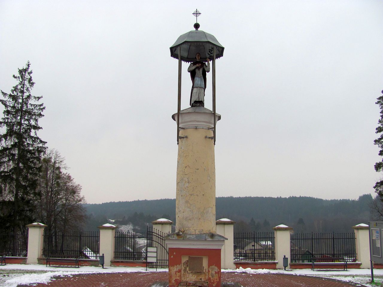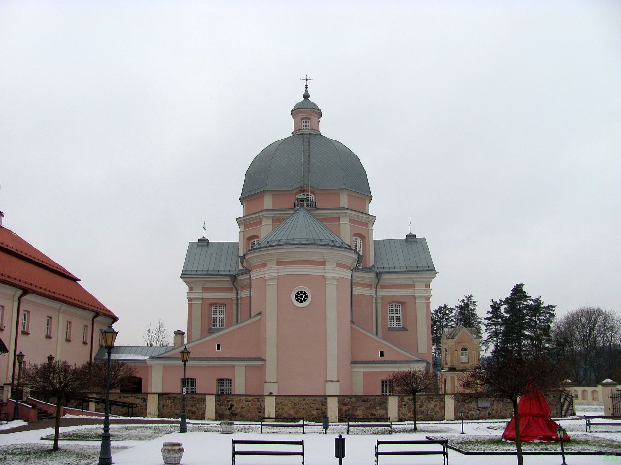 Ехали, и вдруг нам навигатор показывает на заснеженную парковку около холма и говорит, что приехали. Ну встали и начали осматриваться. Никакого костела или монастыря не видно, но дорожка от парковки есть и ведет она наверх на холм. Почему бы не подняться. И вот когда поднялись, то увидели, что правильно сделали. С этого холма открывался отличный вид на костел и монастырь, которые возвышались на соседнем холме, и дорожка сюда проложена не зря. К сожалению, пасмурная погода не давала полностью заиграть краскам этого места. Еще на этом холме стояло какое-то каменное сооружение или остатки сооружения непонятного назначения. Потом выяснилось, что здесь в XIV-м веке строилась каменная крепость. Строительство было прекращено в 1410-м году после Грюнвальдской битвы. А рядом мы обнаружили еще какое-то, может, святое место, на камне стояла лампадка и огонек ее горел. Для кого - неизвестно.