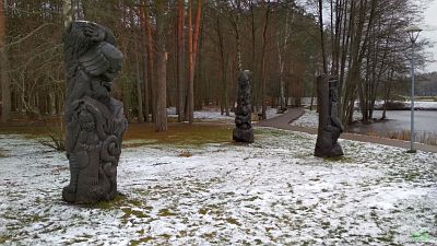 Там еще и парк деревянных скульптур, В 2008 г. их вырезали известные народные мастера Друскининкайского края во время традиционного пленэра резьбы по дереву. Все скульптуры объединяют легенды о Друсконисе: «Остров любви» (Гинтаутас Акстинас), «Сказитель» (Антанас Чяснулис), «Друсконис» (Витаутас Дабрукас), «Источник» (Таурас Чяснулявичюс) и «Книга» братьев Ромаса и Зигмаса Раманаускасов. |