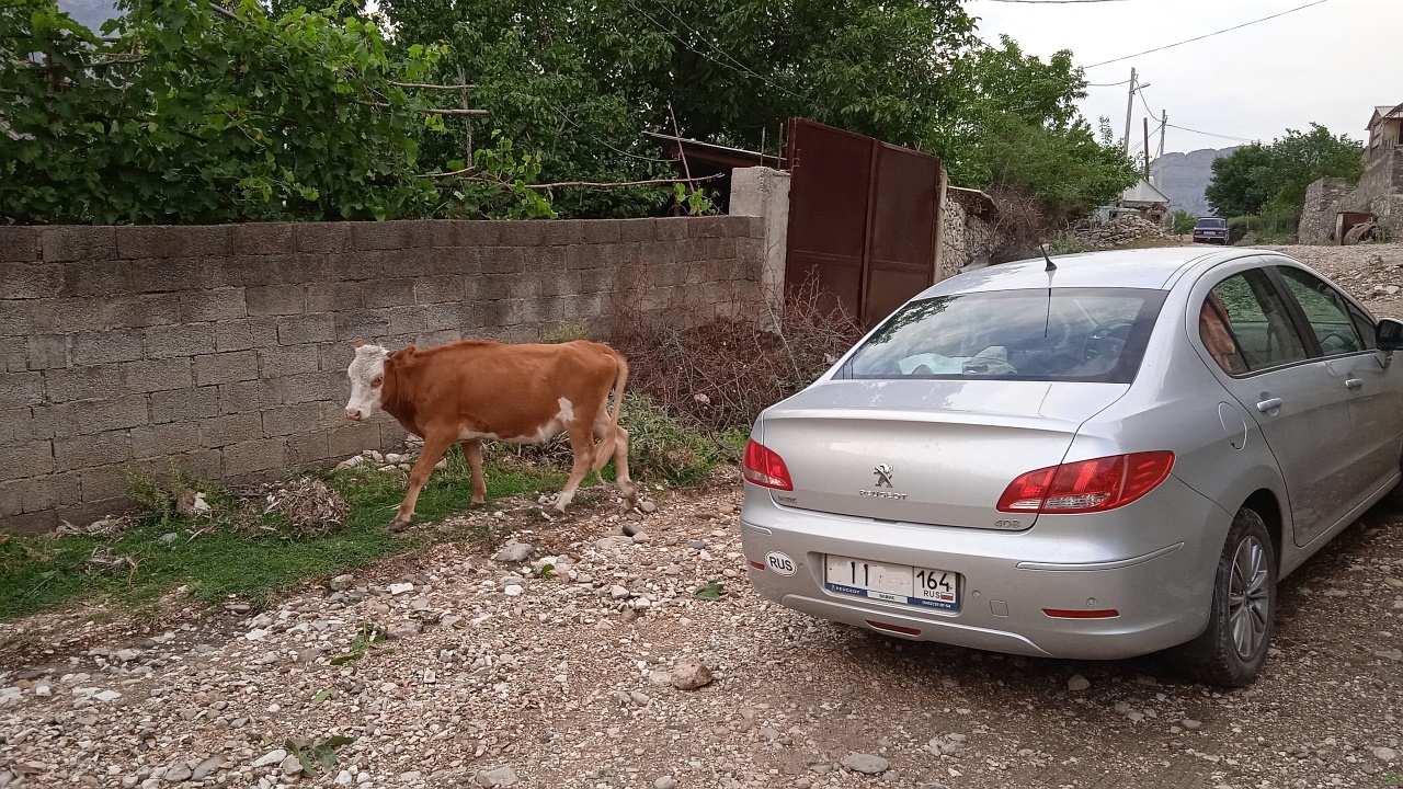 Только проехали мимо того места, где фотографировали красоту, как асфальт взял и кончился. И началась щебёночная дорога, причем, щебёнка временами довольно крупная да ещё и надо было объезжать ямы. Я, конечно, засомневался, туда ли мы едем. Но тут появился указатель на Махачкалу - т.е. это, как минимум, дорога в столицу. Ну, ладно. Правда, щебёнки было не очень много, примерно километров семь и снова пошёл асфальт, сначала плохой, потом постепенно улучшающийся. И снова, как с Карадахской тесниной, указателей на достопримечательность нет... Ну хоть бы какую стрелочку нарисовали... Доехали до развилки - основная дорога вниз, в село Салта, прямо полугрунтовка мимо гаражей в неочевидность. Конечно, поехали вниз.... |