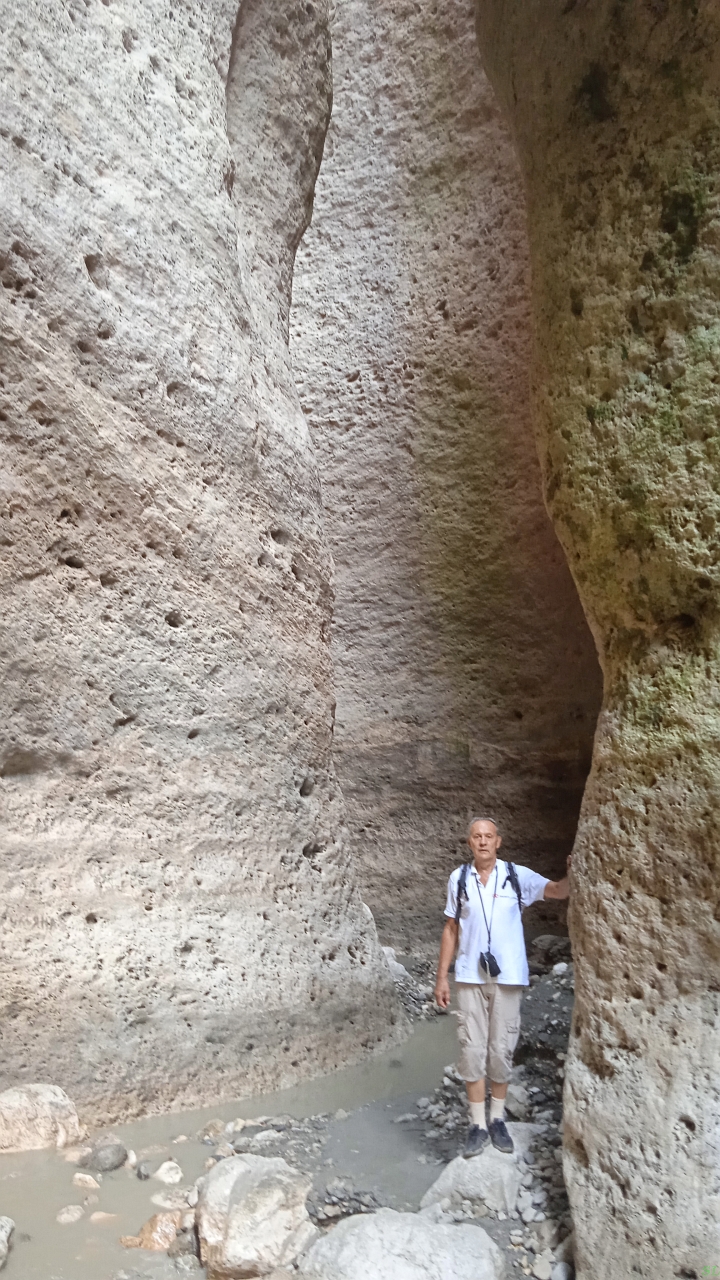Ну и потом сразу раз... и началась теснина. Что могу сказать, природа здесь очень постаралась проделать максимально узкую щель в земле так, чтобы и человек прошел, и внизу была довольно удобная почти везде тропинка. Кадры сразу повернулись в портретную ориентацию, потому что узко и высоко. Ширина теснины от двух до четырёх метров, а максимальная глубина 170 метров. На стенах на высоте 4-5 метров можно увидеть следы потоков воды, т.е. паводки здесь бывают очень обильными и бурными, и в плохую погоду сюда лучше не соваться. Вот, через две недели после нас...:( Фотографии, конечно, однотипные. Но другого здесь трудно ждать, теснина... Тем не менее, фотографировать хотелось, потому что интереснее того, что может сделать природа, не бывает. В паре мест тропа уходила наверх и надо было лезть по лестницам. И если в одном месте лестница металлическая, то другая из того, что было: палочки, верёвочки. Но преодолимо :). |