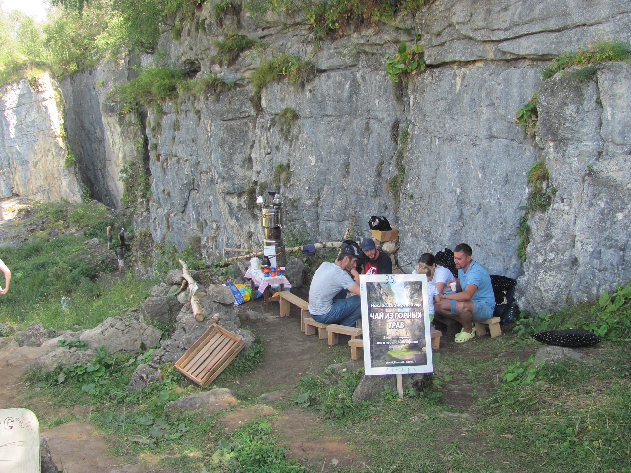 В ущелье прохладно и хорошо, а когда вышли из него, то солнце уже явно стало припекать. И поэтому мы с удовольствием взяли в будочке на поляне чайничек с горным чаем и посидели под навесом, обсыхая на ветерке. Чай очень понравился, стали спрашивать у девушек, нет ли у них такого на "вынос" в пакетах. Они говорят - нет, да мы просто сами набрали трав и ягод вокруг, вот и чай получается. И вы набирайте :). Мы ничего набирать не стали, забрали Шамилевы сапоги и пошли к машине. |