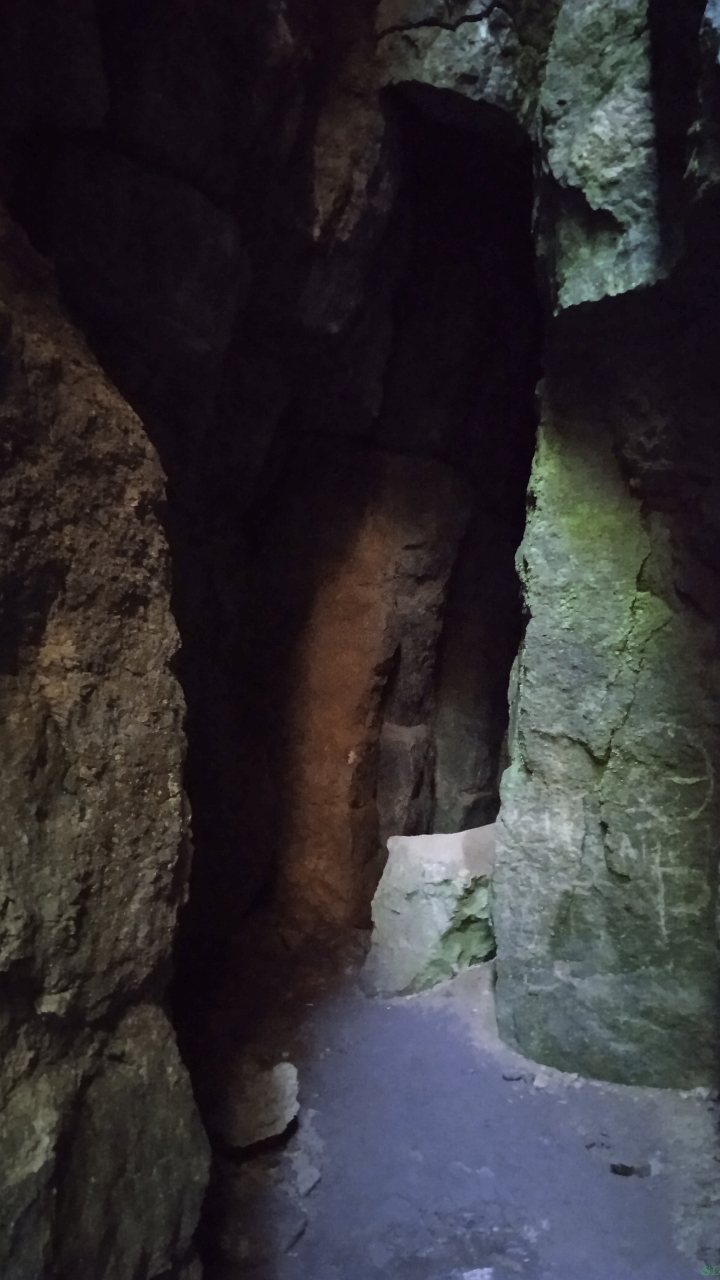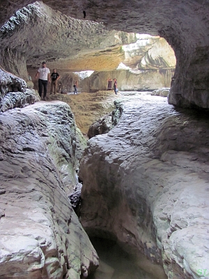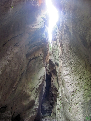 И снова очередная теснина, здесь совсем короткая, заканчивается пещерой. В пещере через дырку в потолке сочится тонкая струйка воды. Это и есть Салтинский водопад. Но думаю, что в другое время здесь вполне может быть и более впечатляющее зрелище. |