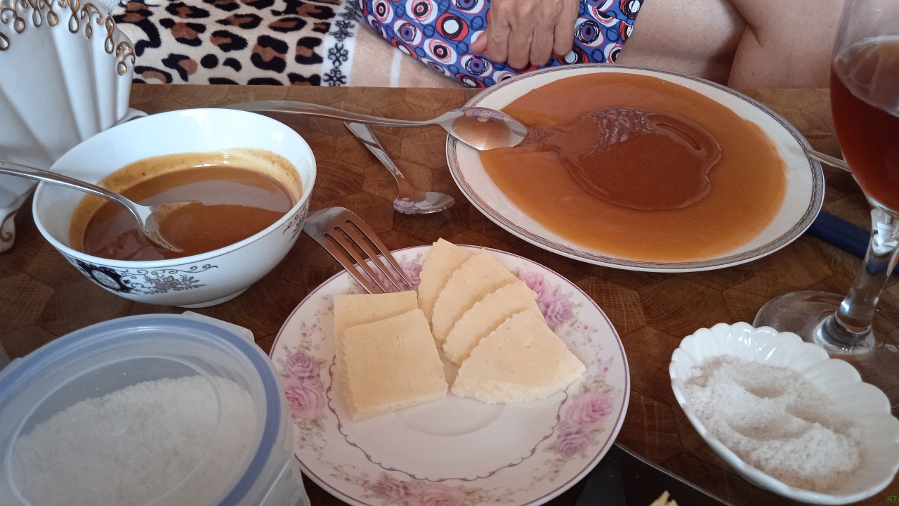Я не стал особо изгаляться и заказал омлет и кофе. А вот Марина, любительница новых вкусов, взяла себе абрикосовую кашу с урбечем. Хозяева явно старались, судя по сервировке. К заказанным блюдам поданы домашний деревенский вкусный хлеб, деревенский же сыр, плотный и соленый. Который просто замечательно сочетался с нашими помидорами (Марина быстренько нарезала тарелочку). |