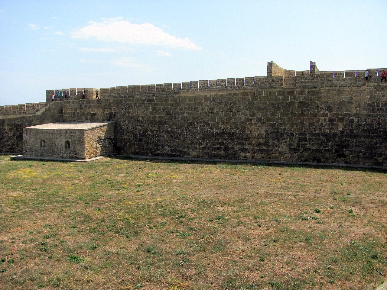 Приехали к крепости Нарын-Кала. Крепость построена в VI-м веке, выполняла важнейшую роль по защите, перекрывая проход вдоль моря от северных нашествий. Охраняется Юнеско. Русские войска брали крепость дважды, сначала под началом Петра I в 1723-м году, потом в 1796-м году под командованием генерала Валериана Зубова. Мы же мирно приехали на небольшую парковку под стенами крепости, которая была вся забита. Но вверх от парковки уходит вымощенная камнем улочка, и вот на ней я и поставил машину в ряду других таких же. Всё, конечно, на солнцепёке. Ну а дальше что, пришли к входу, купили два билета за 300 рублей оба и пошли жариться в крепостном дворе. Со стен крепости, кстати, Дербент весь как на ладони. |