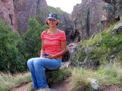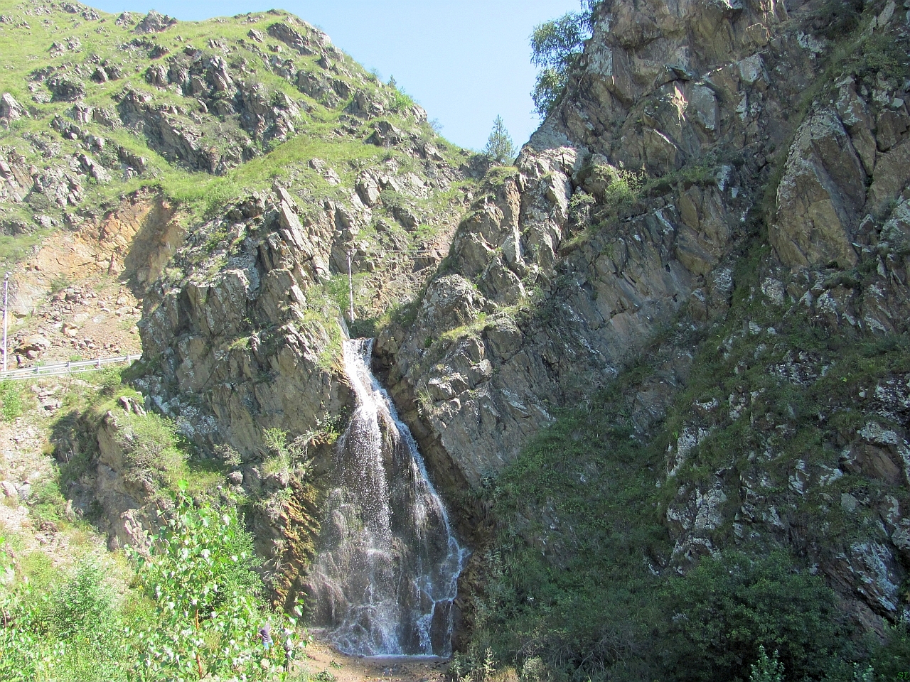 Въезд за шлагбаум платный, я подумал, что ну её на фиг, почти прямо перед ним хорошее место на противоположной обочине, туда и поставили нашу машинку, переобулись, взяли рюкзак и пошли смотреть, что же это такое. Но сначала увидели, что прямо за шлагбаумом довольно тесная парковка, и не потому, что мало места, а потому что много машин, ну очень много. Я даже порадовался, что не стал сюда соваться, сейчас бы толкался тут в поисках места. И чем дальше мы шли по асфальтовой дорожке, тем становилось теснее на её обочинах. Но мы не на машины приехали смотреть, а на урочище. Началось оно для нас с пирамидальных скал, они левее дороги. Потом еще один шлагбаум, здесь парковка кончается, за ним домик. Собственно дальше идёшь туда, куда все идут. Асфальтовая дорожка переходит в натоптанную тропу, мимо термальных источников, в которые вход по расписанию, в какие-то часы женщины, в какие-то мужчины, вечером после шести можно вместе. Мы мимо. Потом тропа приводит к тросу, натянутому через довольно бурную речку, здесь стоят люди и здесь мы узнаём, что, кроме троса, тут раньше был железный мостик, через который можно было перейти на ту сторону, и дальше идти себе нетрудной дорогой куда-то дальше. Но мост этот снесло недавно паводком, и теперь через реку можно перебраться только с утра вброд, держась за трос. С утра уровень воды ниже и течение не такое бурное, потом начинают сильнее таять ледники, и уровень воды в реке повышается. Поэтому на брод сейчас никто не решается, мы тоже. Посмотрели на лежащую на том берегу "голову" и пошли дальше по нашему берегу. А дальше все идут к Почечному ключу и наливают из него минеральной воды. И мы налили немного. Вода холодная и вкусная, прямо-таки нарзан... :). Мы тогда не знали, что это почечный источник, все пьют и мы пьём. Ну, а рядом основной объект, полноводный водопад "Султан Су", ревущий жёлтой мутной водой, извергающейся из какой-то каменной глотки. |