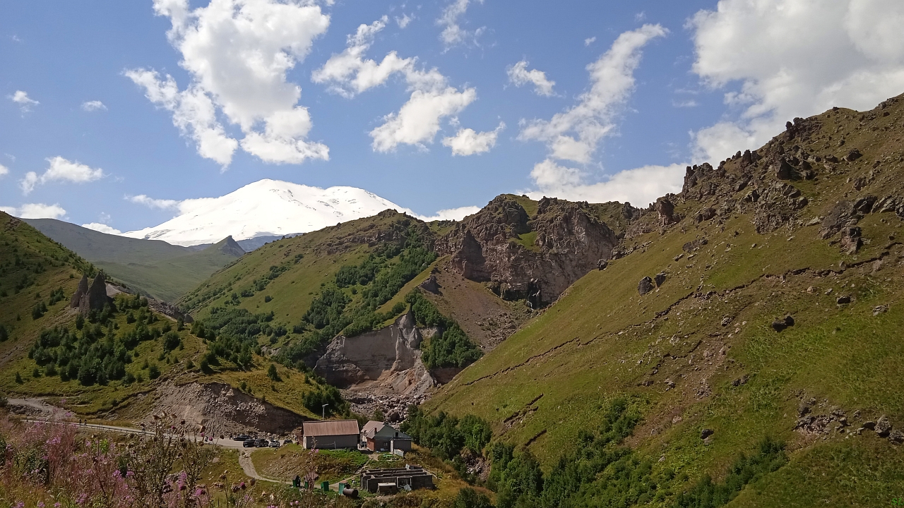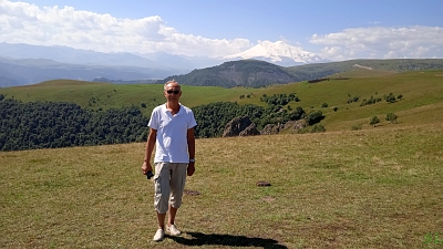Правильнее, наверное, было бы назвать эту часть рассказа по-другому, может, "Снова к Эльбрусу", или "Он опять с нами", или ещё как-то наподобие. Потому что вот только выехали из города, как прямо по курсу появился его величество Эльбрус и так и стоял перед нами, постепенно увеличиваясь в своих размерах по мере приближения. Это был один из тех редких случаев, когда мне не надо было уговаривать Штурмана делать фотографии из машины через лобовое стекло во время движения. Она почти не выпускала гаджеты из рук, Эльбрус ведь очень фотогеничен. Хотя и кроме него, крути головой налево или направо - и везде красота, дорога очень живописна. А вот к этому водопаду Шаджатмаз надо ехать по длинному и довольно крутому спуску, я использовал, в основном, пониженную передачу, стараясь не усердствовать тормозом. А когда остановились посмотреть на водопал, то обратил внимание, что вокруг какая-то дымка стелется над асфальтом, смотрю, а у соседней машины от передних колес валит белый дым, как пар от заливаемого водой костра. Тут же подъехала и встала ещё одна машина, и от её колёс так же повалил дым... Т.е. тормозным колодкам на этом спуске приходится довольно туго, и большая их часть остается здесь, и кажется, что не факт, что у какой-то спускающейся машины тормоза будут в достаточно рабочем состоянии, чтобы вовремя остановиться... Посмотрел на передние колёса нашего Лёвика - тоже, вообще-то, колодки немного подымливали, но не так сильно :). Ну ничего, потом едем вверх, и здесь тормоза остыли, я думаю. Правда, долго ехать не приходилось, только раскатились и стоп, снова видовая площадка, все встают, и мы встаём, позируем. А дальше он, Эльбрус этот, будет позировать и главенствовать в одиночестве. Вот такой мне запомнилась дорога на Джилы-Су. Одна из самых красивых наших дорог.... Фотографий сделано было очень много, выбрать было трудно... |