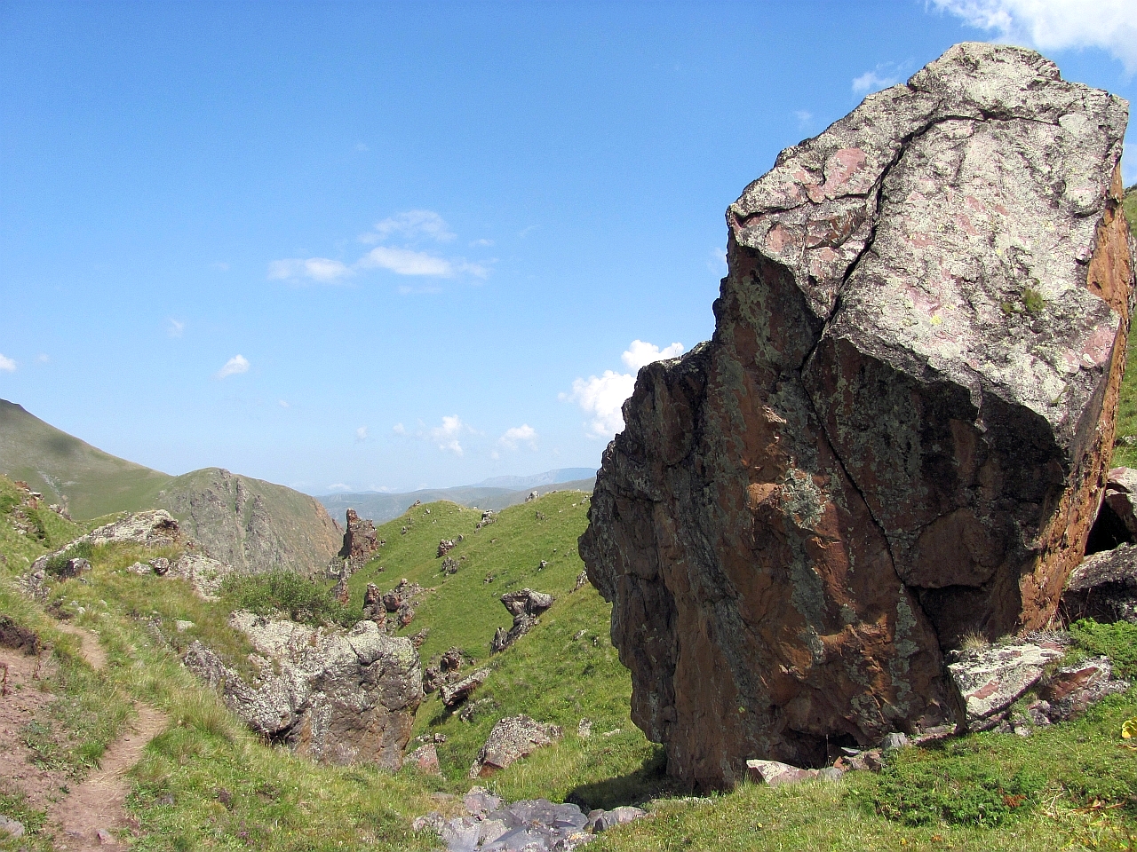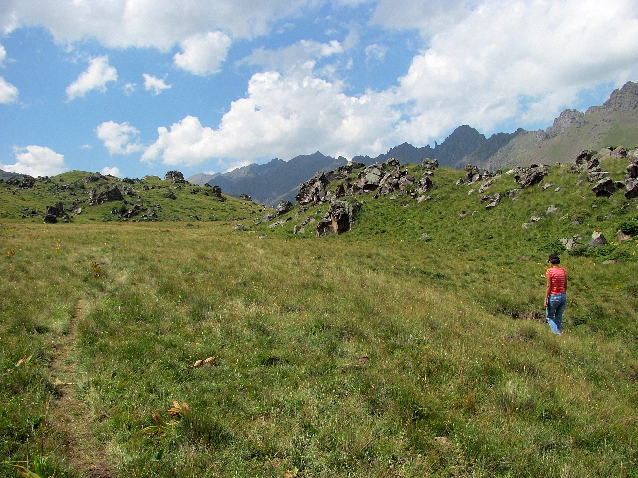 Собственно тут было всё равно, куда идти, совершенно не интересовало, как что вокруг называется, да и не написано тут никаких названий и указателей нет. Вокруг было восхитительно красиво и упоительно здорово. Как-то так. Просто шли вперёд по тропе и шли, куда-то ведь придём :). Тем более, что мы всё время шли по направлению к Эльбрусу, а значит, шли правильно. |