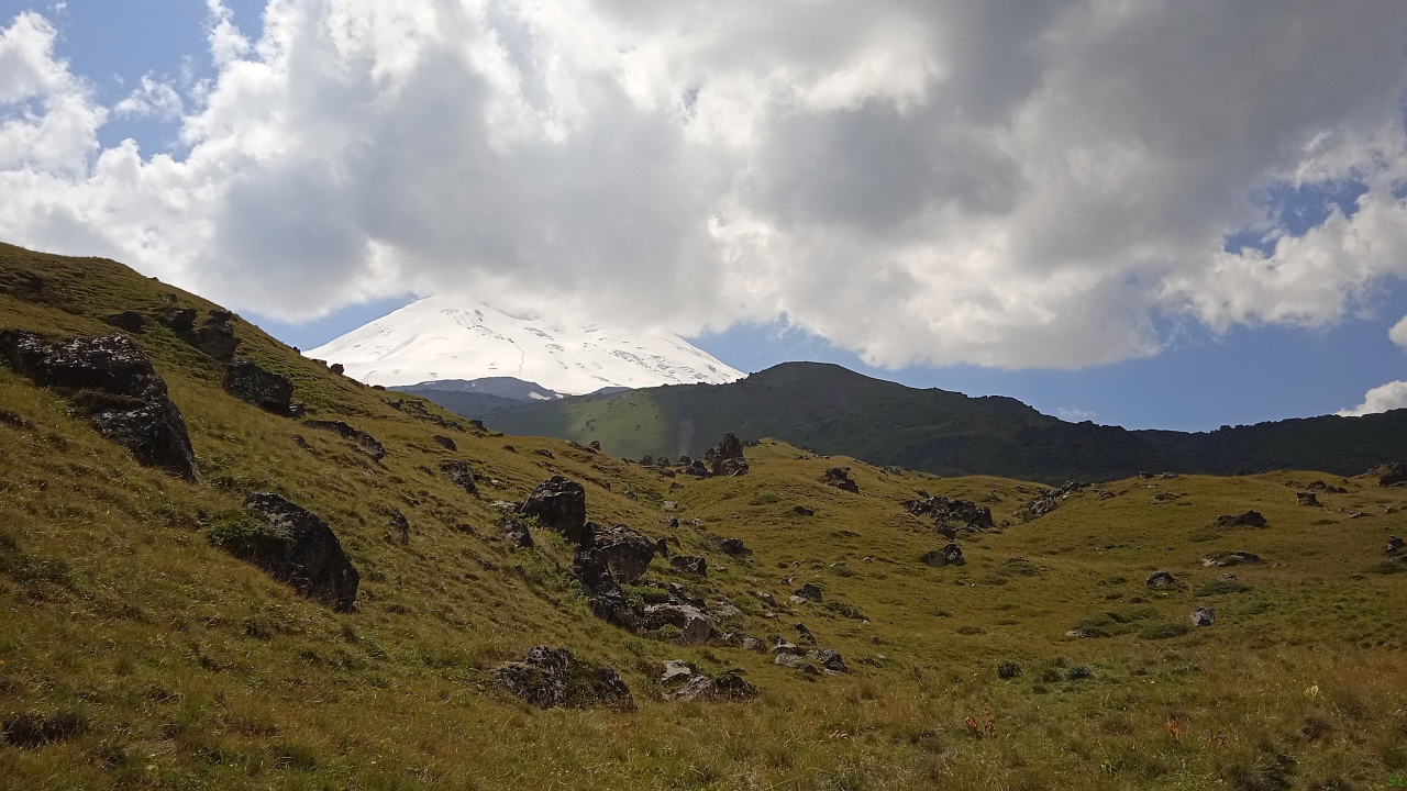 Правда, мы всё же умудрились немного заблудиться, ну как заблудиться, шли себе шли и вдруг поняли, что идём просто по траве, тропы под нами нет. Ну как бы и ладно, направление-то понятное, Эльбрус за спиной. Но вполне могли придти к какому-нибудь обрывчику или ещё к чему-то непролазному. И тогда придётся возвращаться. Поэтому залезли на какую-то скалу повыше и тропу высмотрели, немного в сторону она ушла, вернее, мы от неё, метров на триста. И через неглубокую лощину на тропу мы вылезли, может, конечно, не совсем на ту, по которой шли к источнику, но привела она нас всё равно правильно. Эльбрус, кстати, стал потихоньку прикрываться облачками, правда, они выглядели пока достаточно мирно и красиво. |