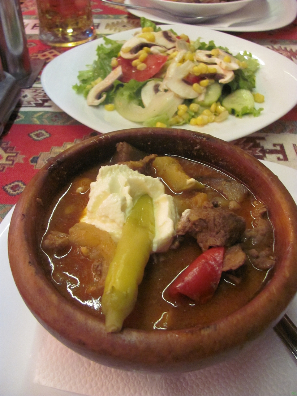 Я не помню, как назывались наши блюда, может, Штурман сможет вспомнить потом. Мне достался, как очень часто бывает со мной на Балканах, какой-то горшочек с мясом и  овощами, у Марины какое-то ассорти, в котором ей явно не понравился гарнир. А я нормально, мне было достаточно вкусно :),  но не на столько, чтобы вкус запомнить, как иногда бывало (ах, какая оленина была в Хевизе - это например, или, ух, какие мидии я ел в Бораке).  Нет, этот ужин  не запомнился и повторить его пока не захотелось.