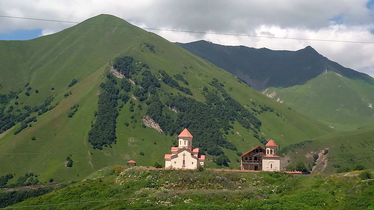 Недалеко от Арки известный горнолыжный курорт Гудаури, сейчас он смотрится так себе, только видны навороченные отели на склонах. Трасса серпантином проползает прямо по улицам поселка, нам навстречу приличная пробка из-за одной мёртво вставшей на крутом подъёме фуры. К слову, внизу, под пробкой уже парковалась машина регулировщика, видимо, будет организовывать реверс. Но мы пока проехали мимо пробки, но не могли проехать мимо отличного вида на местную церковь Вознесения Господня. | ||||