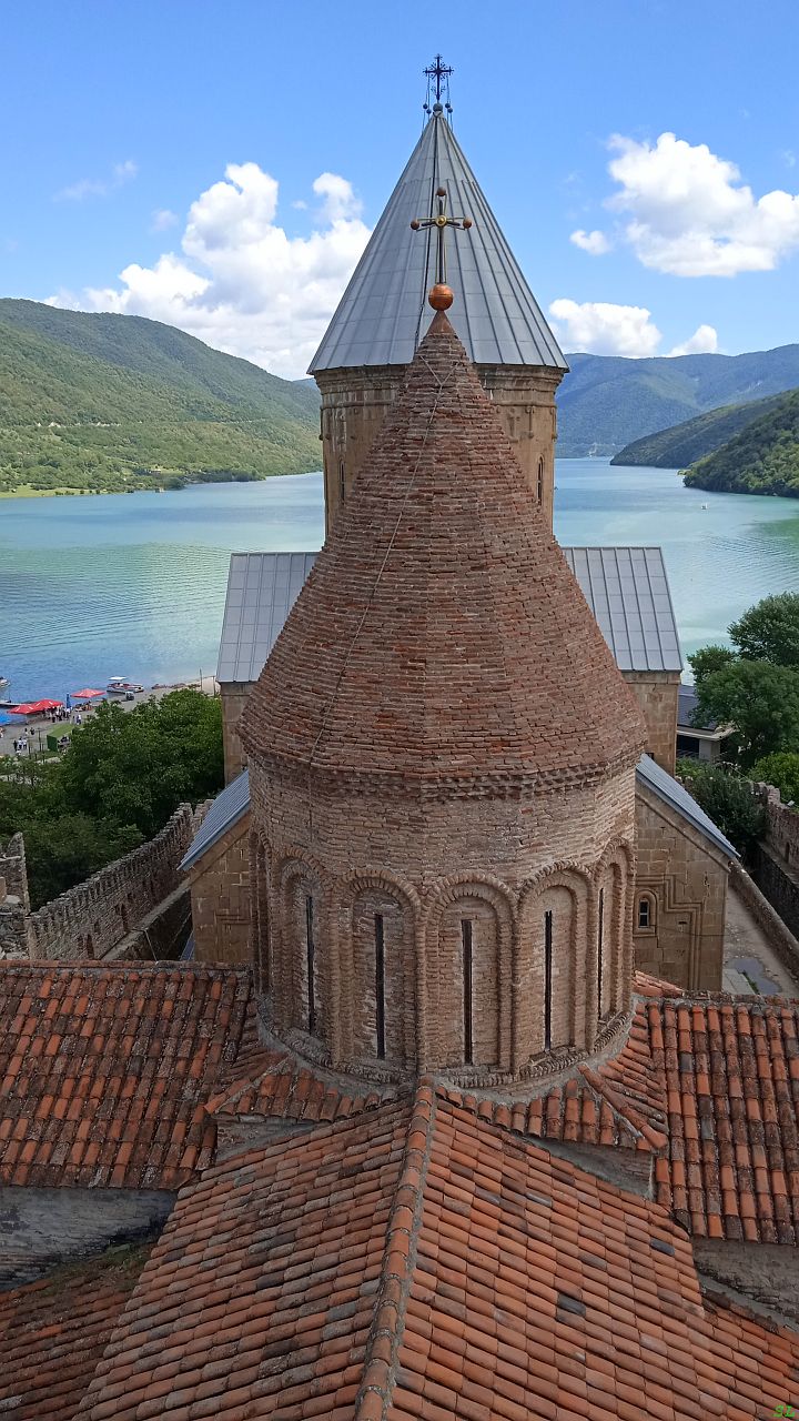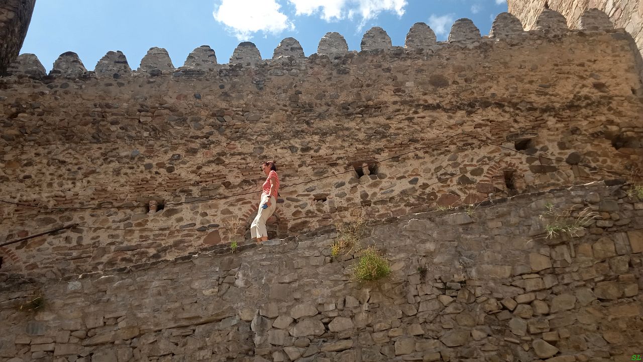 Крепость у нас от трассы слева, около неё платная парковка за шлагбаумом, но справа, на съезде с трассы полно места поставить машину бесплатно. Конечно, ставим её там. Крепость была построена в 16-м веке на слиянии двух рек, большой Арагви и меньшей Ведзатхеви и стала мощным опорным пунктом для правителей этого края. Она очень живописна на фоне рек и хорошей погоды.