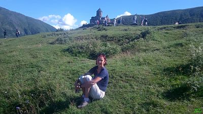 Троицкая церковь в Гергети очень старая, построена в 14-м веке и она, конечно, очень фотогенична, особенно с некоторого расстояния. Поэтому тут все крутятся со своими смартфонами, пытаясь запечатлеться на её фоне как можно в большем количестве поз. Ну и мы тоже. | ||||