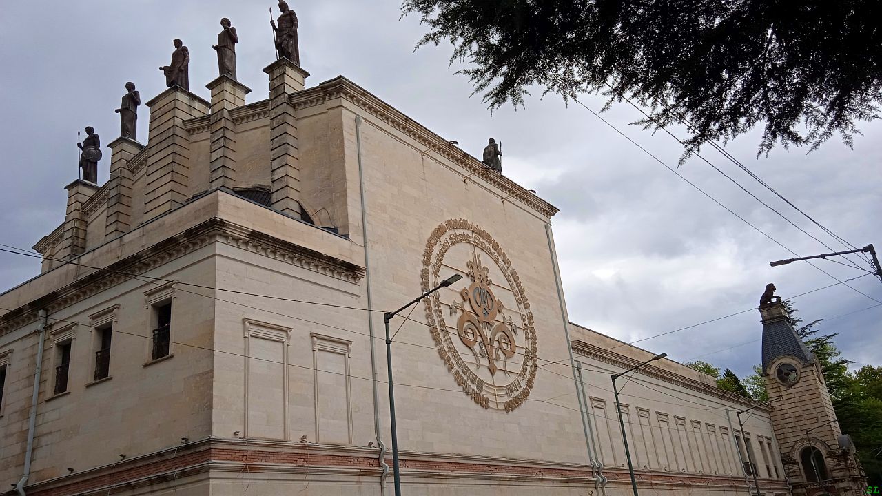 Про домик сразу возникают дачные ассоциации, Марина, похоже, такой бы хотела иметь у нас на даче. Каменный одноэтажный с невысоким потолком, внутри обшит деревом, одна просторная спальня, санузел и маленькая кухонька, ничего лишнего, но всего достаточно. Только бокалов для вина нет, хотя, когда я спросил у хозяина про домашнее вино, он очень оживился и сказал, что делает вино и продает. Заказали у него литр красного за 20 лари (цены растут :)). Хозяин обрадовался, сказал, что ещё и чачу делает и обещал угостить бесплатно. На крыше дома площадка, накрытая виноградником, грозди ещё не спелые. Сюда нам предложили вечером залезть по обычной лестнице и посидеть с вином, полюбоваться видами на местный собор. Только стульев там не было чтобы посидеть, требовалось из кухни туда притащить три специальных пластиковых табуретки, на двух сидеть, на третью, значит, вино поставить. Перед входом в дом большое дерево, хурма с неспелыми плодами. Нас предупредили, чтобы ночью мы не пугались, плоды громко падают с дерева на металлический навес. "Не бойтесь, это хурма, а не соседи к вам стучатся..." Ну а вот денег грузинских у нас пока не было. Спросили разрешения у хозяйки расплатиться позже и выяснили, где тут обменники. Она, конечно, разрешила и рассказала, где у них лучше курс - на главной площади рядом с театром, там и обмен, и идти туда недалеко. Но при этом немного заволновалась, что скоро обменник может закрыться и даже предложила нас туда свозить :). У нас, вообще-то, было в планах пойти на прогулку, но сначала перекусить дома, еда ещё оставалась. Тогда решили организовать вечер по-другому, сначала решить финансовый вопрос, за это время нам как раз вина обещали привезти, потом ужин, потом ещё одна прогулка. Беспокойные хозяева удалились, мы быстренько перекидали вещи и пошли искать требуемое. И действительно, четыреста метров по нашей улице вниз - вот площадь с большим помпезным неработающим фонтаном, вот театр, а вон и обменник светится своим табло и курс нормальный - 30.6 лари за тысячу рублей. Поменяли с запасом на предстоящие экскурсии и жизнь на море, и назад на ужин. Правда, вина нам пока никто не привез, перекусили. запивая еду запасённым вином от Тамуны, оно как раз охладилось до приятной температуры, учитывая, что на улице жаркая духота, высокая влажность и, наверное, за тридцать. Сразу вспомнилась вчерашняя вечерняя свежесть в горах. И как раз к концу ужина подоспели и хозяева с вином и уже не нужной чачей, грамм 50 в стаканчике. Но я её не вылил, сцедил потом в бутылочку, всё равно когда-то пригодится :). Заодно выяснили, во сколько нам они завтрак утром доставят. Снова расстались, снова собрались, на часах около восьми вечера и снова четыреста метров вниз на главную площадь.