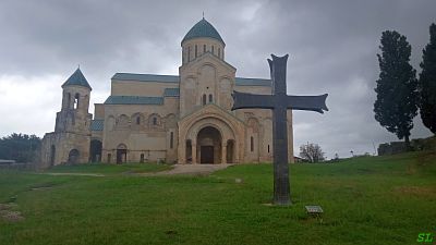 Храм очень старый, построен еще в 1003-м году и был главным столичным храмом Грузинского царства. Это единственный старинный крупный храм в Грузии, построенный на горе. Впоследствии, в результате нескольких войн (с турками, с царской Россией) храм был основательно разрушен и простоял в таком виде до начала 21-го века. В 1994 году его внесли в списки всемирного наследия ЮНЕСКО. После переизбрания на второй срок президент Грузии М. Саакашвили взялся за реставрацию храма, чему сильно воспротивилась ЮНЕСКО и перенесла храм в список объектов, находящихся под угрозой. Но несмотря ни на что, реставрация была завершена в 2012-м году, а ЮНЕСКО в результате исключила храм из всех своих списков, как потерявший свой первоначальный облик. Ну вот и всё, что мы хотели или что успели посмотреть в Кутаиси. Дальше стали думать, что делать. Напомню, что по планам у меня на сегодня было посещение пещеры Прометея, двух каньонов, Окаце и Мартвильского и, по возможности, водопадов Кинчха. Всё это почти по пути на побережье, по крайней мере, в нашем направлении в пределах от 20 до 50 км, только ехать по другой, менее ранговой дороге и через горы. Но сеял дождь от слабого до частого и все эти планы становились проблематичными. Ещё можно было поехать немного назад, там в получасе езды Гелатский монастырь, он то как раз остался под охраной ЮНЕСКО. Трудный выбор... То и другое мы, видимо, не успевали... К тому же монастырь по виду немного похож на храм Баграта, только поменьше.