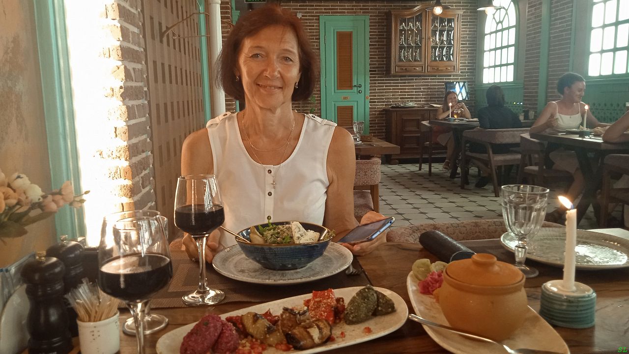 Перед походом в ресторан ещё успели пробежаться по "нашей" улице, мы хотели купить грузинского игристого вина и, конечно же, в одном из магазинчиков оно было, брют (другого не пьём), да ещё и как раз со скидкой. Потом мы много раз такое игристое видели, но везде оно было дороже в полтора раза. Подарок к празднику :)... Вино в холодильник в номере, а сами пошли искать наш ресторан. Ну как искать... налево, потом снова налево и вот он, "Тифлис". Два зала, на первом и втором этажах, нам сначала показали столик на первом, возле музыки, я не захотел, поднялись на второй и тут нашлось отличное место... |