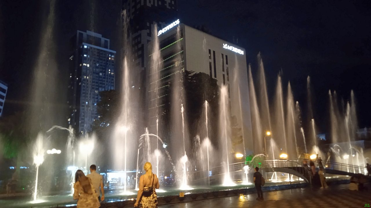 И вот, дома у нас в холодильнике шампанское томится, мы наелись от пуза и нет бы отдыхать, но, конечно же, понеслись искать местные "танцующие фонтаны". Причём я еще пока не очень понимал, где мы и как тут всё расположено, но Штурман взяла управление в свои руки - и прямо, направо, налево через светящийся, ещё пока непонятный город, пару раз уточнили у кого-то и вот они, фонтаны... Честно говоря, после аналога в Шекветили эти не особо впечатлили - меньше цвета, музыки и фантазии. Но всё равно хорошо...