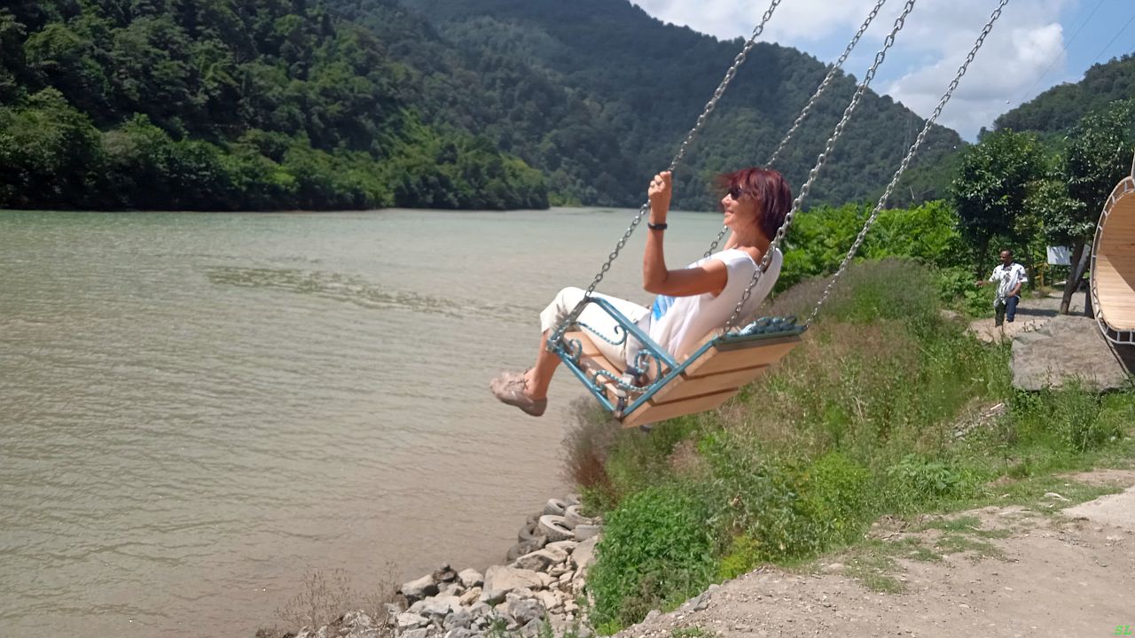И мы поехали, а если бы мы приехали сюда не так спонтанно, то наверняка посмотрели бы ещё и мост царицы Тамары, ещё одна здешняя достопримечательность, и до неё было метров триста. Но мы не знали про это и уехали. И ладно. Зато на обратном пути остановились в красивом месте, в районе слияния двух рек, Аджарискали и Чарохи, сначала хотели там покататься на кораблике, но его надо было ждать полчаса, поэтому ограничились качелями. |
