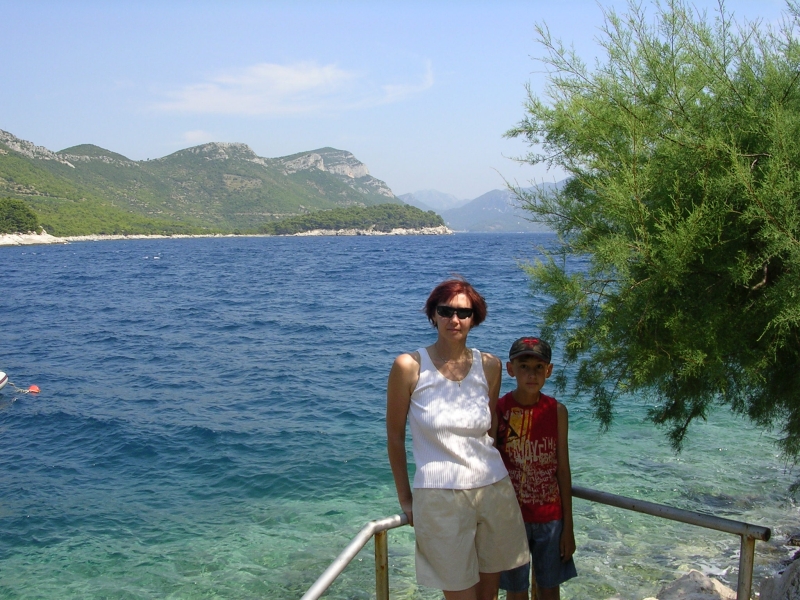 Выше этой площадки метрах в 20 расположены два дома Иво. Наш номер с отдельным входом на первом этаже, веранда в цветах со столиком и зонтиком, из нее вход в кухню-столовую, затем спальня с 2-мя кроватями и из нее дверь в санузел с душем и прочим. Вода горячая за счет большого титана, который надо было не забывать включать. Ниже упомянутой уже площадки под живописной скалой расположен наш основной пляж, от нашей веранды расстояние до него не больше 60 метров. В воду удивительной чистоты и прозрачности можно было входить по крупноватой гальке пляжа или сбоку по ступенькам, которые приводили к подводной дорожке из мелкой округлой гальки, приятной для ступней. Здесь мы чаще всего и входили в воду. Купальное место ограничено с одной стороны скалами, которые часто использовались молодыми парнями для прыжков в воду, с другой стороны камнями лавового вида, в которых тоже находилось развлечение. Вокруг них было интересно поплавать с маской, а по ним полазить в целях изучения представителей морского мира - крабиков, рыбок и рыб, морских звезд. Удалось даже увидеть один раз довольно крупного, длиной с полметра, кальмара, протискивающегося в расщелину между камнями. В ста метрах в другую сторону по улице второй сельский пляж более классического вида, но открытый для волн и ветра и поэтому менее нами облюбованный. Правда, в ветреную погоду здесь нравилось Илюшке кататься на волнах на матрасе. Поэтому иногда ходили и сюда. Все туристическое население деревни, на наш взгляд, не превышало 100-150 человек и все быстро примелькались и здоровались. Обстановка деревни не располагала к нарядам и практически единственной нашей одеждой были купальники. Таким образом, мы попали практически в идеальное на наш взгляд место для отдыха на море. Почти девственная природа, чистейшая вода, замечательные и удобный пляжи, небольшое количество народа, замечательное вино, удобное расположение дома по отношению ко всему необходимому, замечательные в своей отзывчивости и не назойливости хозяева. И все это окружено удивительными по красоте видами Хорватии. Одним словом - рай! И нам ничего не оставалось, как начинать им наслаждаться, что и сделали :). Жизнь в основном была построена так - не спеша просыпались, обычно часам к 9, не спеша завтракали - кофе, яйца, ветчина, сок и на море. В обед поднимались домой и перекусывали - сын мюсли с молоком, мы обычно местный деликатес - пршут с пивом. Потом отдых и снова на море. Вечером ужин в кафе или дома и потом посиделки на террасе с вином и фруктами. Эти посиделки с видами на море и закат продолжались обычно долго, сын уходил спать, а мы еще сидели и обсуждали, как нам тут хорошо и что надо сделать, чтобы завтра было еще лучше.