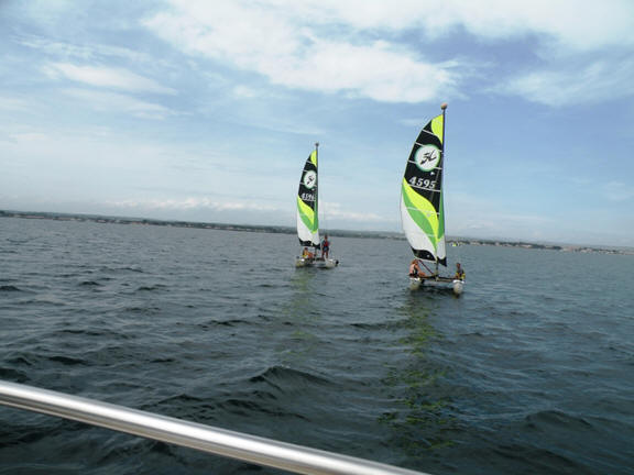Когда кончились сети - появилась другая напасть: всякие там мелкие прогулочные лодочки, катамараны, серферисты всякие. А они - быстрые. И идут наперерез все время. Я даже задумался – кто должен уступать дорогу? С одной стороны – мы все-таки какой-никакой, а – корабль. Значит – они. А с другой стороны на автодороге у велосипедистов в цивилизованных странах всегда преимущество. Может все-таки – мы? Однако, вон на снимке - остановились, пропускают. Понимают - кто тут главный. Стали попадаться такие же баржи, как и мы навстречу. Ну, слава богу, значит идем в верном направлении🙂